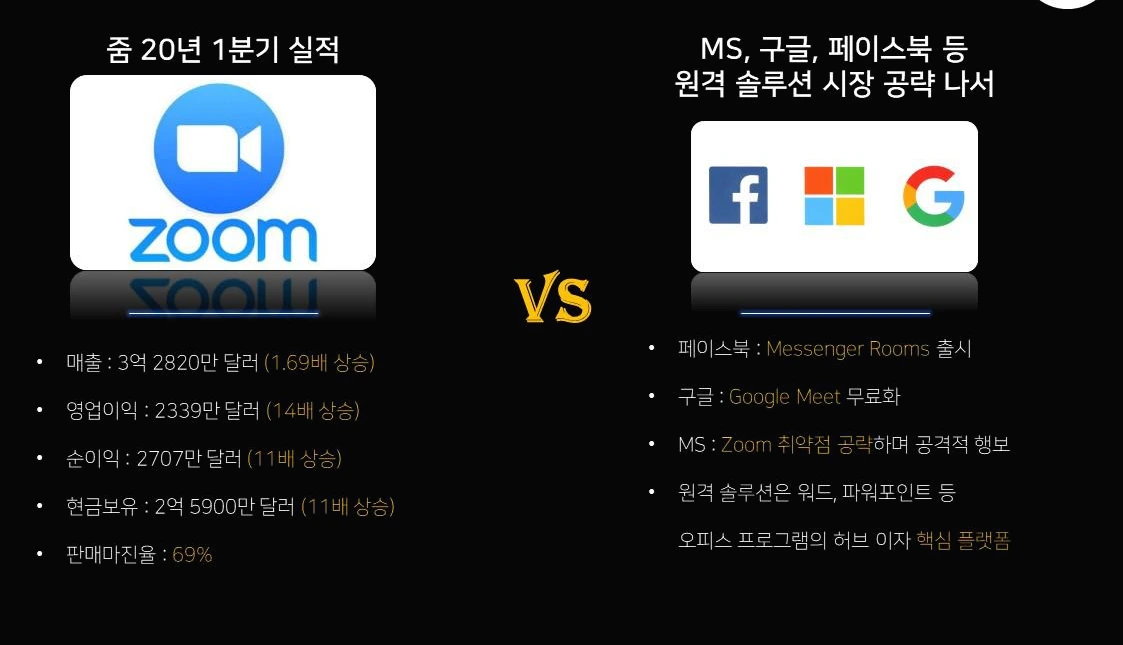 재택근무를 하려면 뭐가 필요할까요? 바로 재택근무 솔루션이 필요하겠죠. 이로 인해 재택근무 시장이 엄청나게 성장했는데요. 특히 핵심이 되는 원격회의 시스템은 코로나19 이후 13배 성장했다고 합니다. 가장 큰 혜택을 보고 있는 Zoom은 올해 1분기 동안만 영업이익 14배, 현금보유가 11배 성장했습니다. 특히 판매당 마진율이 69%로 높은 수익성을 자랑합니다. 이후 마이크로소프트, 페이스북, 구글 등도 새로운 원격 서비스를 출시하며 재택근무 솔루션 시장을 뜨겁게 달구고 있습니다.