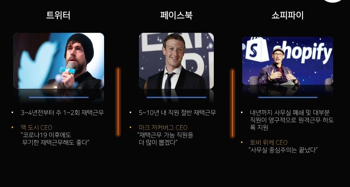 특히 IT기업들이 재택근무 활성화에 선도적으로 나서고 있는데요. 트위터, 페이스북, 쇼피파이 등 IT 기업들이 나서고 있고, 마스터카드를 포함한 금융사, 히타치제작소 등 제조업에서도 50% 이상 상시 재택근무를 시도하고 있습니다. 재택근무 상시화를 위해 채용기준, 평가기준, 봉급체계 등을 개정하고 있으며, 좀 더 근본적인 변화를 위해 미래 노동 TF팀을 운영하는 곳도 있습니다.