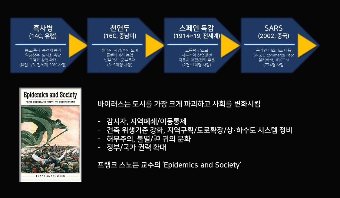 역사를 살펴보면, 지금까지 수 차례 펜데믹이 있어왔고, 그때마다 세계는 큰 변화를 겪었습니다. 14세기 흑사병부터 천연두 그리고 스페인 독감 최근의 SARS까지... 펜데믹은 인구와 노동구조 임금체계에 영향을 주며 결국 중세 봉건제를 무너트리고 자본주의로 진화시키는 계기가 되었으며 스페인 독감과 SARS는 상거래 방식에 큰 변화를 가져왔습니다.