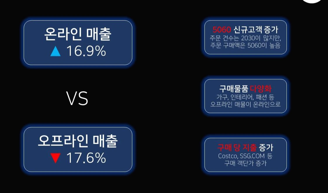 일상 생활에서는 온라인 서비스의 급성장을 꼽을 수 있습니다. 지난 3월 기준으로 온라인 유통 매출은 전년 동월 대비 16.9% 성장한 반면 오프라인 매출은 –17.6% 감소했으며, 이 추세는 지속될 것으로 전망됩니다. 특히 3가지 중요한 변화로는 5060 신규고객 증가와 구매물품 다양화, 구매 당 지출 증가로 꼽힙니다. 5060세대가 온라인 구매대열에 합류하면서 신규고객이 증가하였고, 코로나19로 인해 식료품은 물론 일상물품과 가구까지 이제는 온라인에서 구매하지 못할 게 없을 정도로 증가하였으며, 비싼 온라인 제품이 늘어나면서 구매 당 지출이 증가하였습니다.