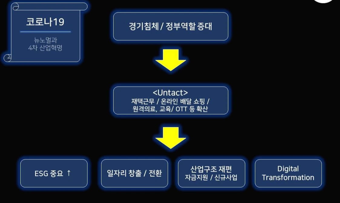코로나19로 인한 가장 큰 특징은 무엇일까요?? 바로 언택트인데요. 이로 인한 배달과 쇼핑 등의 온라인화, 원격진료/의료/근무, 넷플릭스와 같은 OTT 등 4차 산업혁명 기술 확산이 특징이며, 방역과 경기부양 등을 통해 정부의 몫과 역할이 커지고 있습니다. 이에 더하여 서서히 진행되던 글로벌화의 퇴조와 함께 Reshoring, 신생국 위기, 그린 뉴딜, 산업구조 재편과 기업집중, 일자리 전환 및 공동체 재정립 요구의 가속화 등이 있습니다.