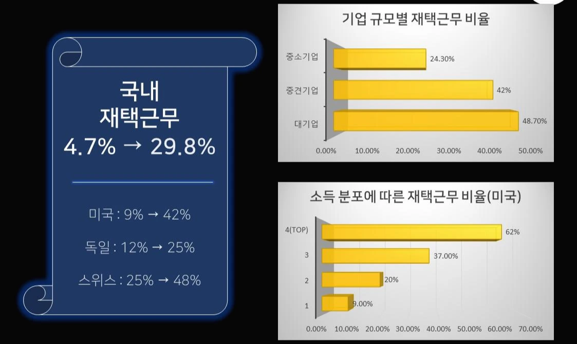 재택근무 증가비율은 기업규모와 소득분포에 따라 상당한 격차가 나타내는데, 대기업이 48.7% 중견기업이 42.0%로 절반수치에 가까운 숫자가 재택근무를 하는 반면, 중소기업은 24%그쳤는데요. 이는 미국과도 유사합니다. 델소프트웨어코리아 대표로 있다 어도비코리아 대표로 가신 대표님 역시 6개월간 회사 출근 한번 하지 않았다고 페이스북에 올리기도 하셨습니다.