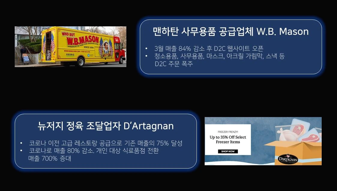 재택근무로 인해 B2B 기업들은 D2C 즉 Direct to Consumer 소비자에게 직접 다가가기 위해 사업을 전환/확장하면서 새로운 기회를 만들고 있습니다. 약 2조 2천억원 규모의 100년 넘은 사무용품 명가인 W.B Mason은 코로나19로 3월 매출이 84% 감소하자 D2C 웹사이트를 오픈하였고, 가정 주문이 폭증하면서 어느 정도 매출을 회복하였다고 합니다. 기존 품목뿐만 아니라 마스크, 아크릴 가림막 등 방역 관련 수요증가가 크게 일조했습니다.