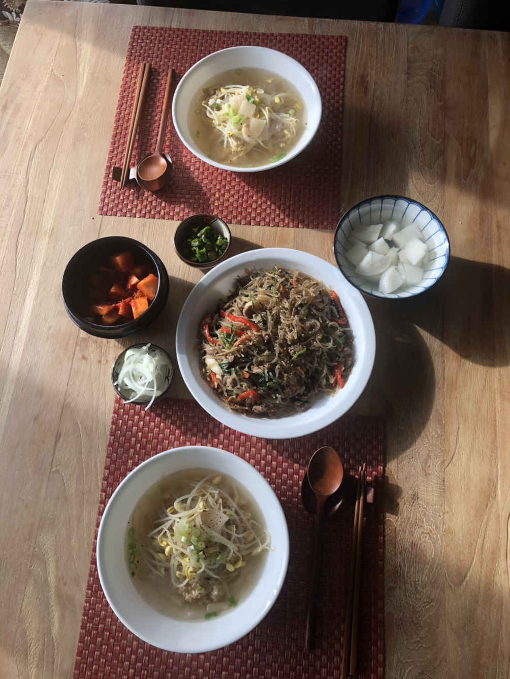 주말이 끝나가는 마지막 날에 저는 심플한 식사를 하고 싶어서 콩나물국밥을 만들었고 (사실 사두었던 콩나물을 먹어야 했기에), 레시피를 찾아보니 새우젓과 청양고추를 넣으면 맛있다고 해서 먹기 바로 전에 넣을 수 있도록 준비했고, 젓갈을 좋아하지 않는 남편은 그냥 소금과 후추를 넣었지요. 어쩔 땐 이렇게 심플한 음식이 더 정겹고 맛있답니다.