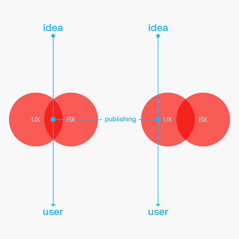 요즘 UX 방법론이 넘쳐난다. 퍼소나, 린 프로세스, 빅데이터, 사용자 테스트, 인지 심리학 등 이 모든 것은 아이디어를 명확하게 전달하기 위한 도구이지, 아이디어 자체가 아니다. 예를 들어 서비스 하나를 만든다고 가정해보자. 일반적인 프로세스는 BX팀에서 서비스의 시각적 상징 로고, 패턴, 비주얼 등을 만들고, 그것을 활용해 UX팀에서 모바일 플랫폼으로 구축한다. 또, 서비스를 홍보할 마케팅 소스들 중 온라인 배너는 UX에서 오프라인 포스터 및 프린트들은 BX에서 제작한다. 참 일의 분담이 잘되어 보인다. 하지만 BX 디자이너에게 간단한 모바일 디자인을 요청한다거나, UX 디자이너에게 포스터 디자인을 요청하면 본인들의 디자인 영역이 아니라고 디자인을 거부한다. 이는 디자인 조직 구조상 당연한 결과다. 하지만, 이것은 아이디어를 전달함에 있어 환경에 대한 문제로 이해하는 것과, BX와 UX는 다른 디자인이라고 이해하는 것에 큰 차이가 있다. 전자의 경우 환경에 대한 이해가 충족되면 디자이너로서 성장이 가능하고, 후자의 경우는 환경에 대한 이해를 디자인이라고 착각하는 경우다. 후자의 경우는 디자이너로 성장하는데 한계가 있다.