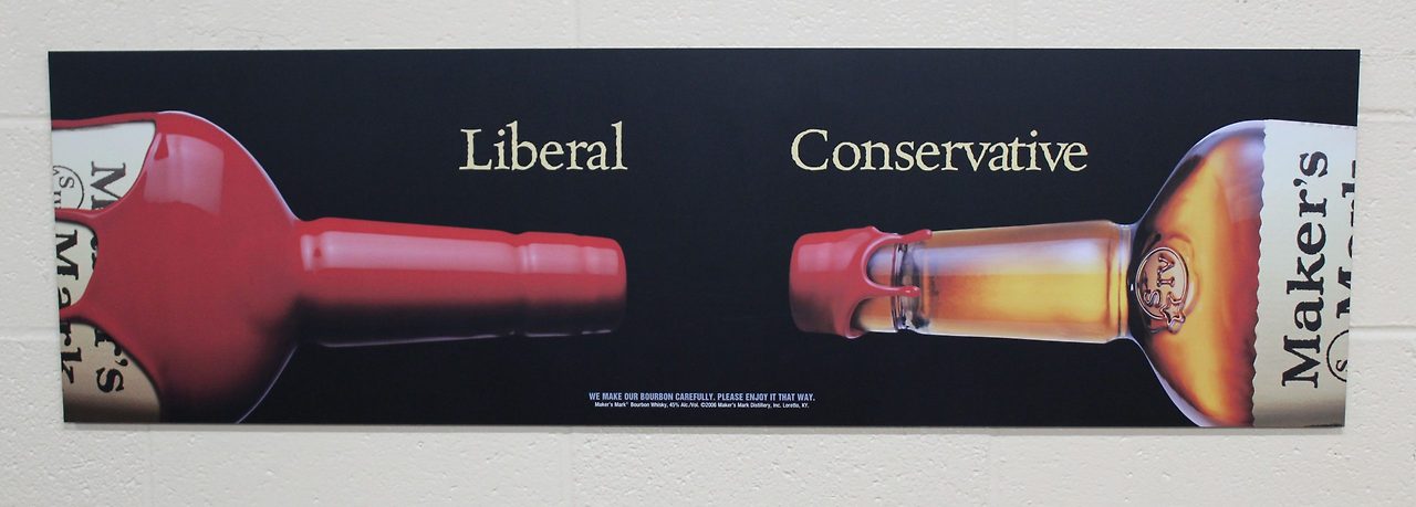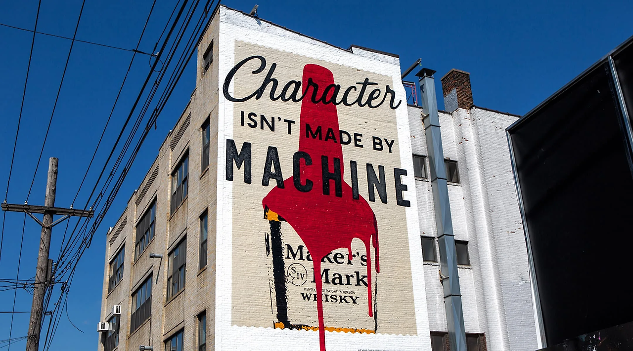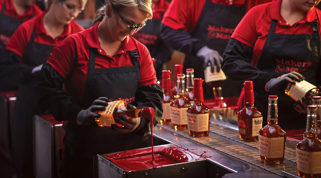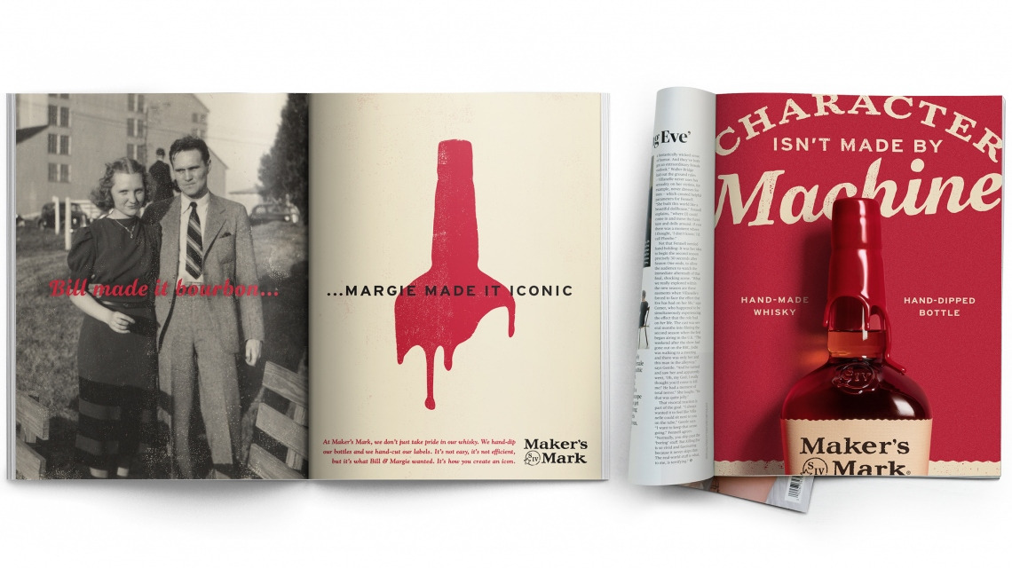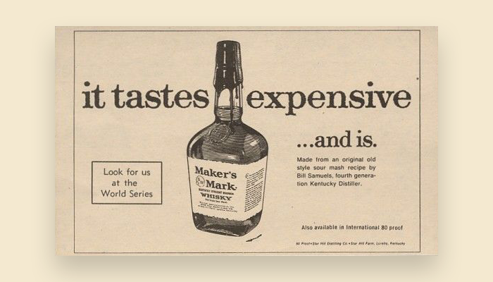 이 아이디어는 빌 새무얼스 시니어의 부인인 마저리 여사의 아이디어다. 또 라벨과 병 디자인 또한 그녀의 아이디어다. 그녀는 메이커스 마크의 브랜드 디렉터인 셈이다. 그녀는 가족회의 때 병의 상단 밀봉을 일일이 하나씩 왁스로 밀봉하자는 아이디어를 냈다. 하지만 빌 새무얼스 시니어는 인건비와 재료비가 들기 때문에 반대했다. 위스키가 맛만 좋으면 되지 무슨 그런 쓸데없는 짓을 하냐며 반대했다. 그러자 마저리 여사는 대학시절 누가 공부를 잘했는지 따지기 시작했다. 둘은 대학 동창이었는데 마저리 여사는 과 수석으로 졸업했지만 빌 새무얼스 시니어는 꼴찌에 가깝게 졸업했다. 그렇게 메이커스 마크의 독보적인 디자인 시그니처가 탄생했다. 그녀는 메이커스 마크라는 네이밍 또한 개발했다. 영국제 백랍 제품을 수집해 온 그녀는 장인들의 제품에는 항상 장인들의 표지(mark)가 새겨져 있는 것에 영감을 받는다. 장인들의 표지(Maker's Mark), 메이커스 마크라는 이름이 그렇게 탄생했다. 소량 핸드메이드로 제작되는 제조 철학과 딱 맞아떨어지는 브랜드 디자인이 탄생한 것이다. 한 마디로 위스키계의 장인이라는 이미지로 브랜딩을 한 것이다. 아래 이미지는 1966년에 진행한 광고다.