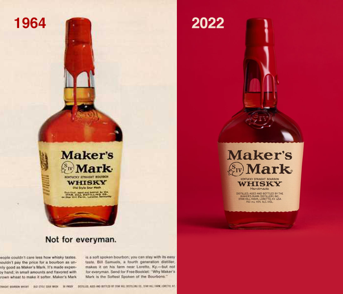 그리고 "모든 사람들을 위한 것이 아닙니다."라는 1964년의 광고. 1960년대의 병 디자인을 지금까지 동일하게 유지하고 있다는 것은 매우 흥미롭다. 아마 위스키 브랜드 전체를 통틀어 초기 병 디자인을 동일하게 유지하고 있는 브랜드는 몇 안 될 거라 생각한다. 그건 처음 병 디자인의 퀄리티가 매우 높다는 반증이다. 퀄리티가 높기 때문에 그 형태를 계속 유지할 수 있는 이유라 생각한다. 그리고 약 60년 동안 동일한 메이커스 마크가 없었다는 뜻이기도 하다. 멋지지 않은가! 혹시라도 다 마신 병을 버리려 하는가? 그렇다면 잠시 생각을 해보길 바란다. 당신이 가지고 있는 빈병은 60년 동안 유일한 하나뿐인 메이커스 마크 병이다. 그 이유는 아래 디자인 헤리티지 부분을 참고하길 바란다. 그 후 흘러내리는 붉은 밀봉을 시그니처로 현대까지 브랜딩을 전개하고 있다.