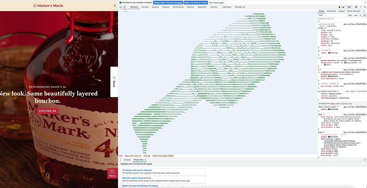 또 재미있는 건 사이트 <head> 소스 코드를 보면 메이커스 마크 위스키를 표현한 아스키 아트(Ascii Art)를 확인할 수 있다. 모르고 지나 칠 번 했지만 운 좋게 발견했다. 개발자의 센스가 돋보인다. 그리고 아스키 아트 마지막에 숨겨진 메시지. We make our bourbon carefully. Please enjoy it that way.