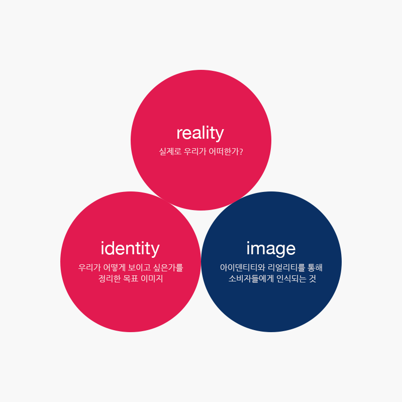 브랜다임앤파트너즈의 황부영 대표의 말을 빌리자면, 브랜드는 ‘아이덴티티(identity)’ ‘이미지(image)’ ‘리얼리티(reality)’ 세 가지 측면에서 살펴볼 수 있다. 아이덴티티는 ‘우리가 어떻게 보이고 싶은 바’를 말하고, 이미지는 ‘우리가 실제로 남에게 보이고 있는 바’를 말한다. 그렇다면 리얼리티는 ‘실제로 그러한가?’이다. 본질인 아이덴티티를 어떻게 실현하고(리얼리티), 어떻게 사람들의 인식 속에 각인시키느냐(이미지)에 따라 브랜드의 성공 여부가 갈린다.