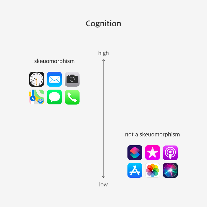 모바일 기술의 발달로 인해 시장의 제품과 서비스가 급격하게 디지털화되면서 형태가 없는 것들에 형태를 만들어야 하는 경우가 허다하다. 형태가 없는 것들에 형태를 부여할 때는 기존의 아날로그 오프라인에서 강하게 인식되어 있는 메타포로 형태를 디자인하는 것이 인식에 유리하다. 애플은 아이폰을 처음 출시할 때 아이폰 GUI 철학에 스큐어모피즘을 기반으로 메타포를 활용했다. 아이폰의 기본 어플들은 물리적 형태가 없는 디지털 서비스다. 디지털 코드로만 존재하며 물리적인 형태는 존재하지 않는다. 하지만 사용자에게 서비스를 인식시키기 위해서는 서비스를 대표하는 시각적 아이콘이 필요하다. 애플은 각 서비스의 아이콘을 스큐어모피즘의 철학에서 가져왔다.