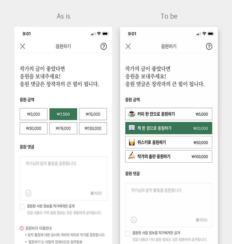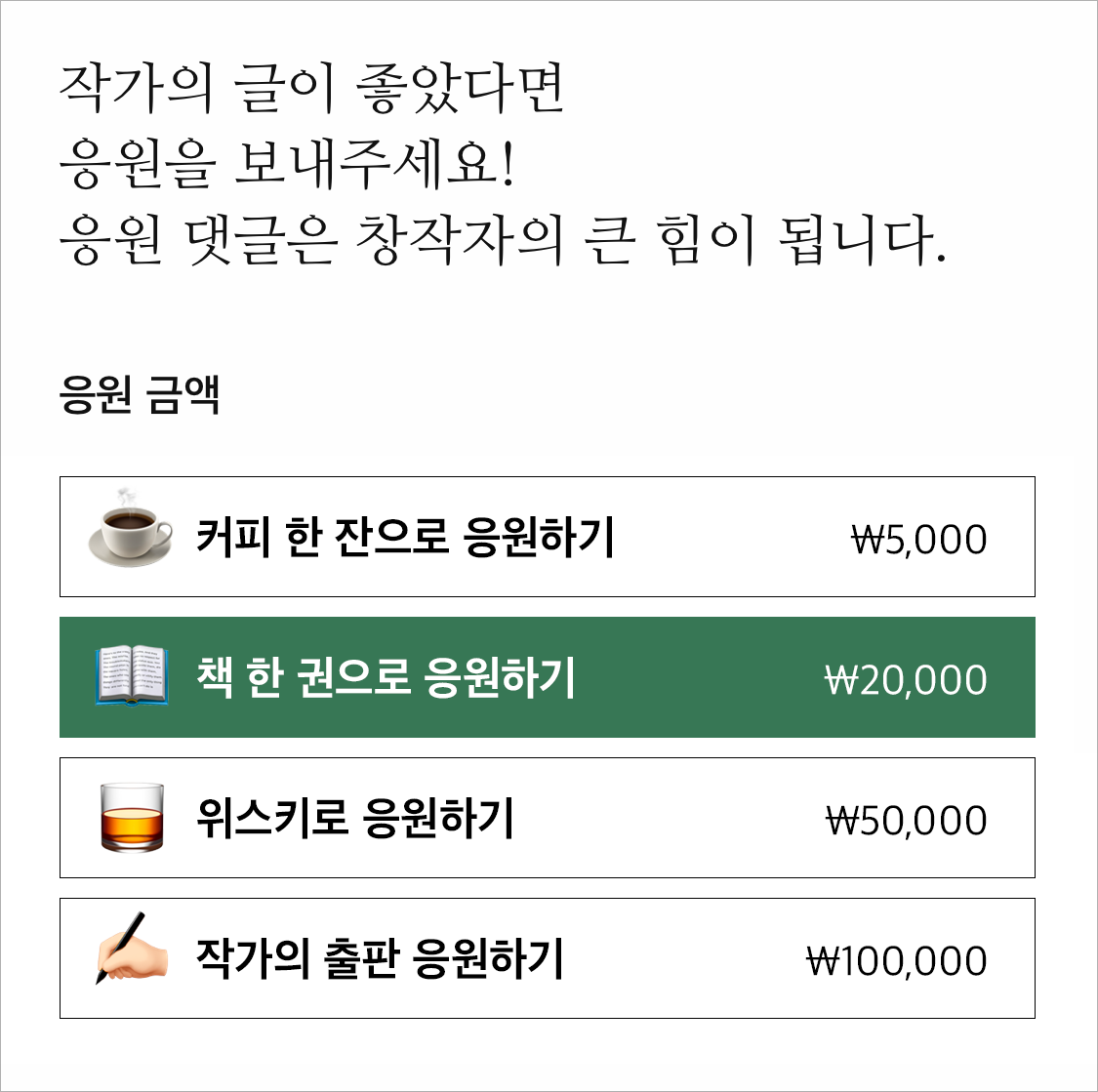 어떤가? 작가가 글을 지속적으로 쓰기 위해 응원하기의 상징적인 의미가 더 강화되지 않았는가? 단순한 금액이 아닌 금액에 상징적인 의미를 담아 표현하면 더 설득력 있고 콘셉트가 강화된다. 위스키는 개인적인 기호이니 이해 바란다. 4가지의 상직적인(커피, 책, 위스키, 출판) 키워드는 리서치나 설문을 통해 더 논리적으로 선정할 수 있다.