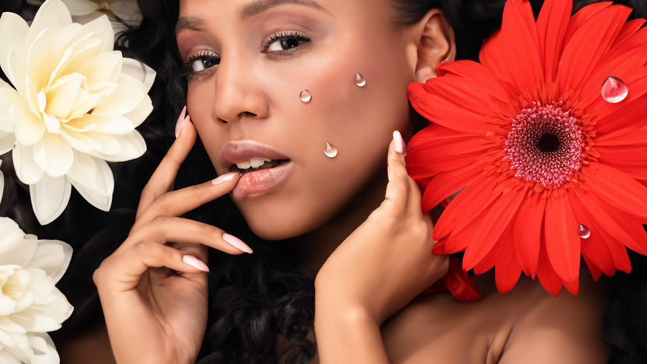'Beauty Model women Images'로 꽤 괜찮은 모델 이미지가 생성 됐다. 이 모델을 화장품 브랜드의 비주얼을 만들어 보자. 좀 더 Beauty의 느낌을 내기 위해 양쪽에 'flower' 명령어를 통해 꽃을 추가해 봤다. 왼쪽 꽃은 'flower' 명령어로 생성했고, 오른쪽은 'flower red' 명령어로 생성했다.