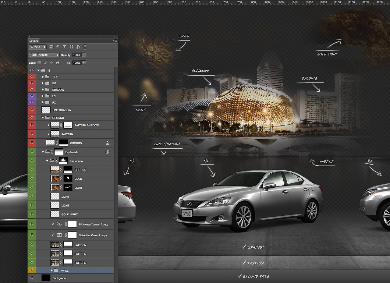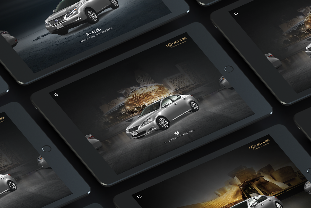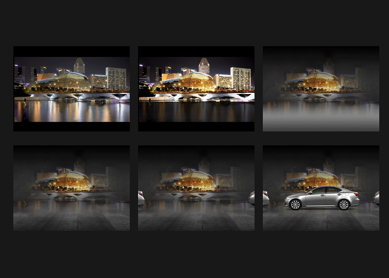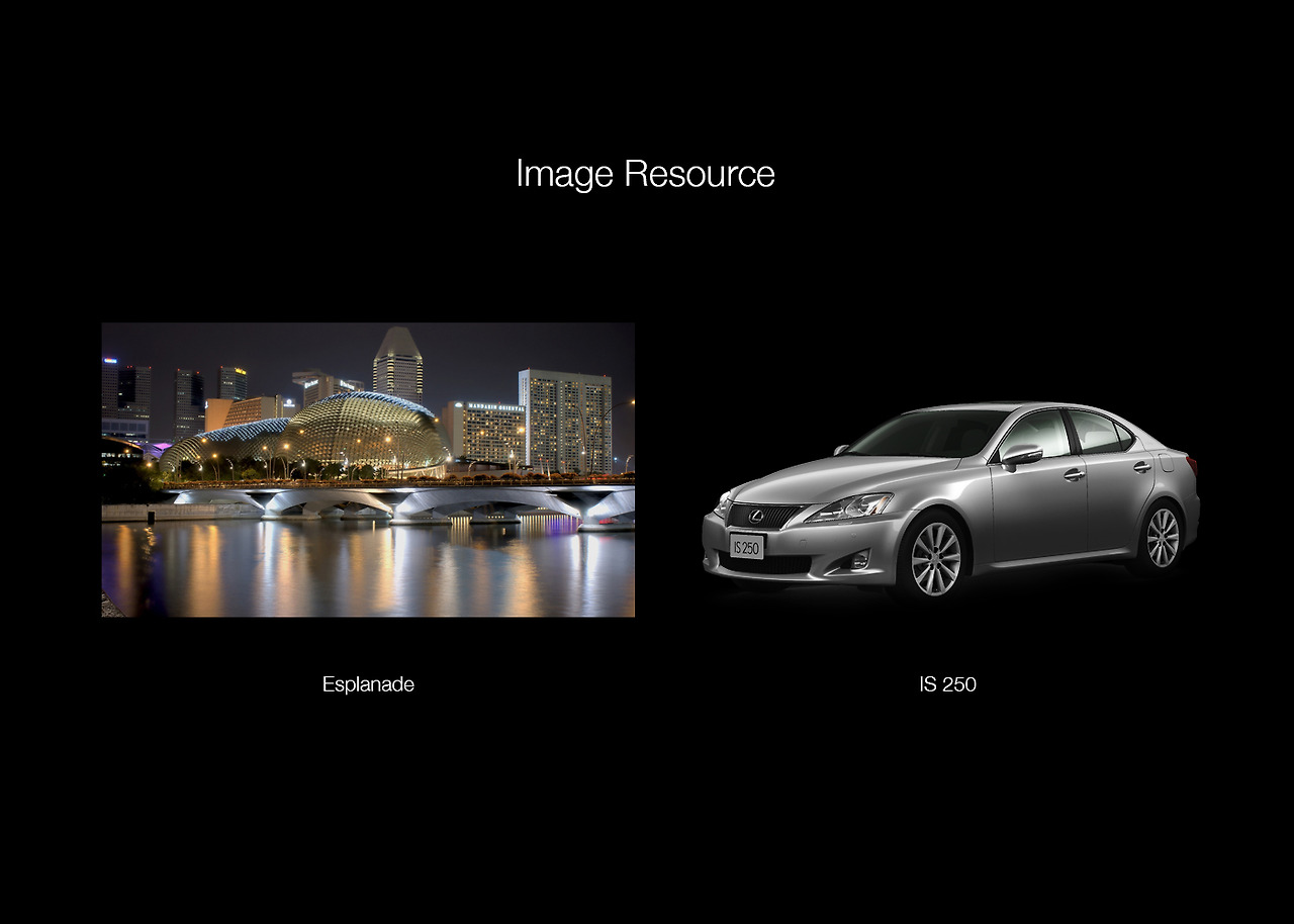 포토샵은 원래 UI 디자인 툴이 아니다. 포토샵은 비주얼 디자인 툴이다. 텍스트 기반의 웹 환경에서 프로모션 중심의 웹으로 발전되면서 포토샵은 웹 UI의 영역도 품게 되었다. 하지만 포토샵의 본질을 겪어보지 못한 세대들은 포토샵의 활용성을 간과한다. 이는 컨텐츠의 퀄리티 하락으로 이어진다. 인터페이스 디자인에 투자하는 만큼 컨텐츠 디자인에 투자를 아끼지 않아야 한다. 주니어 디자이너들은 포토샵의 크리에티브 기능을 공부해야 한다. 포토샵 역량을 높이는 방법은 간단하다. 적은 리소스로 컨텐츠를 디자인할 수 있어야 한다. 포토샵이 손에 익을수록 적은 리소스로 컨텐츠를 제작할 수 있는 능력이 생긴다. 디자인을 하다 보면 다양한 경우가 많다. 리소스 제공 없이 디자인 요청이 있을 때도 있다. 그때 어떻게 할 것인가? 난 UI 디자이너이니까 UI만 디자인하겠다고 할 것인가? 아니면 컨텐츠 없으면 디자인할 수 없다고 할 것인가? 여기 2개의 이미지 리소스를 활용하여 새로운 비주얼 컨텐츠를 만드는 포토샵의 활용을 예로 들어본다. 수년 전 아무런 소스가 제공되지 않았던 렉서스 iPAD 개발 사례다. 제공받은 이미지는 차량의 3D 모델링 컷뿐이었다. 세계 럭셔리한 건축물 이미지를 렉서스에 투영시키자는 컨셉으로 진행했다.