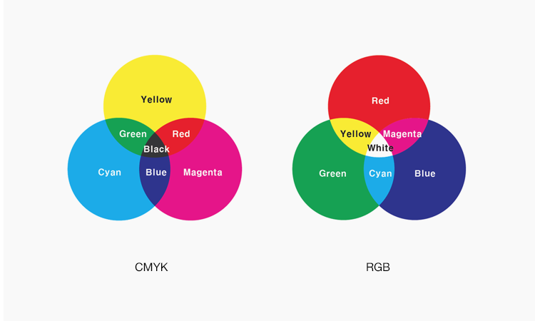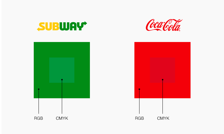 CMYK는 4가지, 파랑(Cyan), 자주(Magenta), 노랑(Yellow), 검정(Key=Black) 잉크의 감산혼합법으로 출력이 되고, RGB는 빛의 3 원색, Red, Green, Blue를 가산혼합법으로 디스플레이에 출력되기 때문에 환경상 같은 컬러 값이 사용될 수 없다. 대부분 브랜드 컬러값은 CMYK와 RGB 버전으로 분리하여 관리하고 사용한다.