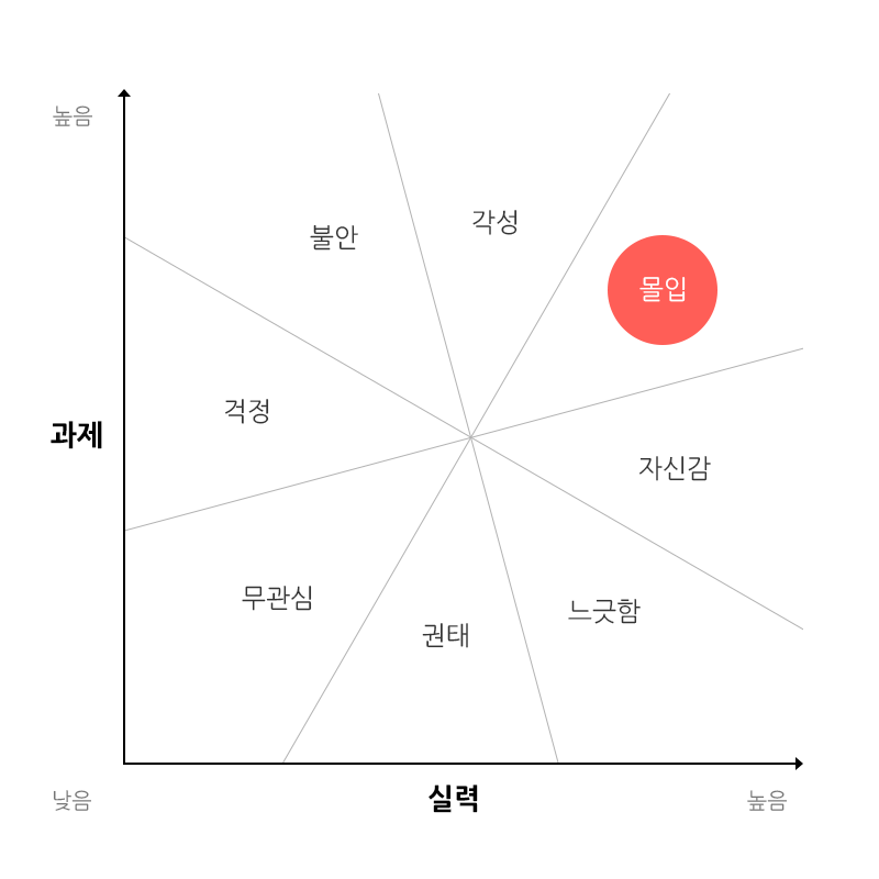 이직 후 회사 생활은 순탄하지 않았다. 2년 차였지만 제대로 된 기본기가 없었던 탓인지 사수와 디렉터의 요구를 잘 따라가지 못했다. 당연히 시안에 투자하는 시간 또한 길어지게 되고, 기존 에이전시에서는 볼 수 없는 경쟁구도 또한 맛보게 됐다. 사수들의 보이지 않는 경쟁은 치열했다. 누군가의 수상 소식은 누군가의 위축을 불러왔고, 야근 없는 퇴근은 스스로 경쟁을 포기하는 선언과 같았다. 그렇다고 누가 누군가를 비방하고 비난하지는 않았다. 그 당시 사수들의 경쟁은 사실 디자인에 대한 엄청난 몰입이었다. 시안 작업에 들어가면 사수들은 굉장히 많은 시간을 시안에 투자한다. 경우에 따라 다르지만 투자하는 시간은 대부분 소모적이지 않았다. 당시 나는 주니어였기 때문에 철야에 적극적으로 투입시키지 않았다. 그래도 꽤 늦은 시간에 택시를 타고 퇴근했다. 그렇게 퇴근할 때 어깨너머로 본 사수들의 시안은 다음날 출근하면 하룻밤 사이 눈에 띄게 디벨롭되어 갔다. 어떻게 그런 몰입이 가능할까? 심리학자 칙센트미하이는 [몰입의 즐거움]에서 과제와 실력의 함수 관계에 따른 경험의 질에 대에 언급했다. 아래 그래프를 보면 몰입은 두 변수가 모두 높을 때 나타난다.