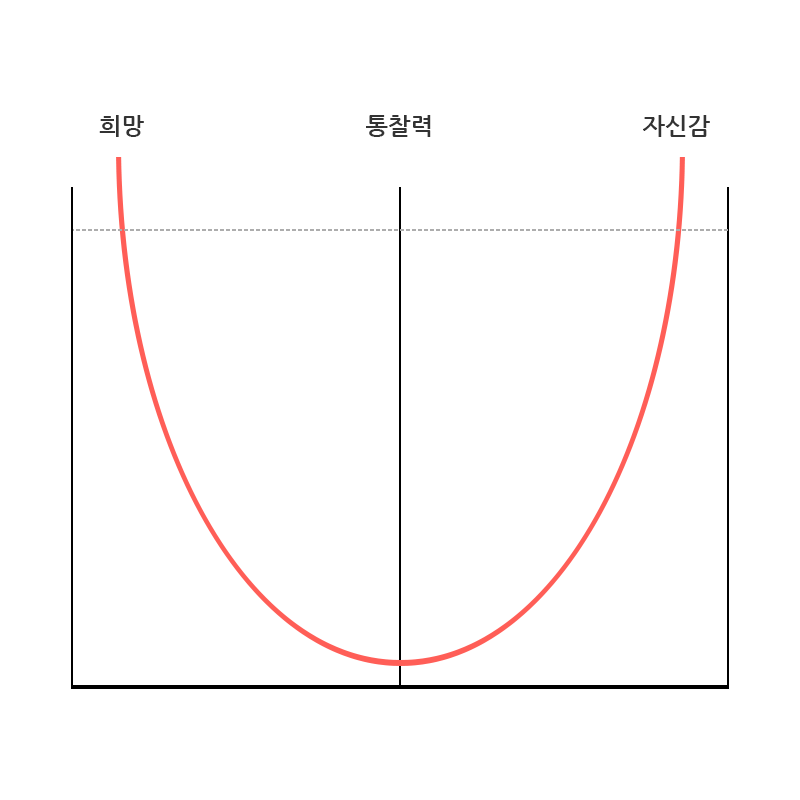 디자인을 하면서 고난은 오기 마련이다. 아무리 훌륭한 사수와 디렉터 그리고 명확한 목표가 있다고 한들 실력의 한계는 언제나 찾아온다. 나는 그 한계를 디자이너의 고난 지점이라 한다. 그 고난을 이겨내면 다음 단계로 성장하지만 그렇지 않은 경우 자괴감이 드는 것은 물론이고 자신감 또한 곤두박질친다. 이 고난이라는 것은 우리가 목표를 이루기 위해 반드시 거쳐야 하는 퀘스트와 같다. 목표를 이루기 위해 퀘스트를 거쳐야 하는 건 인생 불멸의 진리다. 목표가 있다면 퀘스트를 부정하지 말고 받아들이자. 그래야 성장한다. 다시, 디자이너의 고난 지점에 대해 설명하면 조직행동론 전문가 칩 히스, 댄 히스는 [스위치]에서 세계적인 디자인 회사 IDEO의 프로젝트 분위기 그래프라는 것을 언급했다. 주로 프로젝트를 진행할 때 나타는 현상에 대한 그래프다. 그래프는 U자 모양으로 왼쪽에는 '희망'이 쓰여있고 오른쪽에는 '자신감' 그리고 그 사이에 움푹 들어간 부분은 '통찰력'이라 적혀 있다.