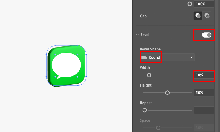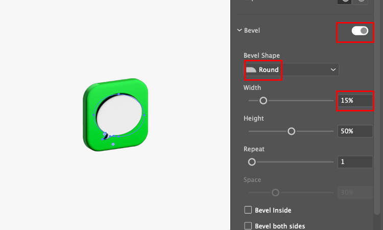 Bevel Shape을 Round로 선택, Width 값은 15%.
