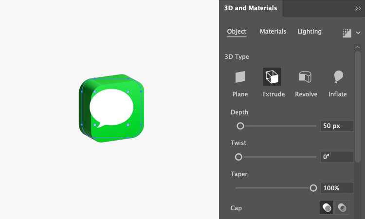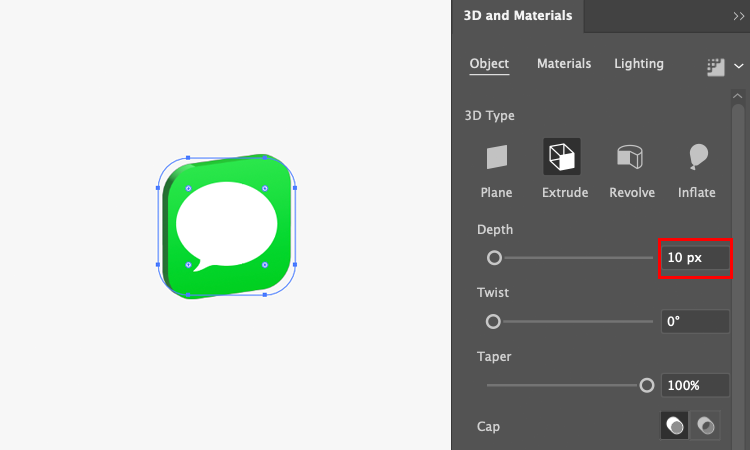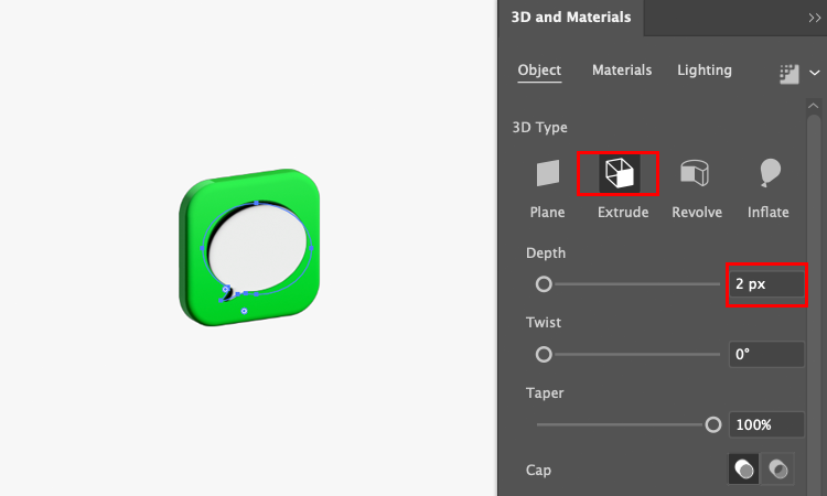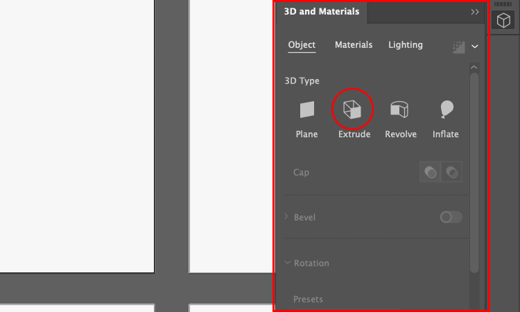 3D and Materials 창이 열리면 이제 선택한 개체에 3D 효과를 적용해 주면 된다.