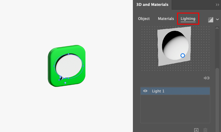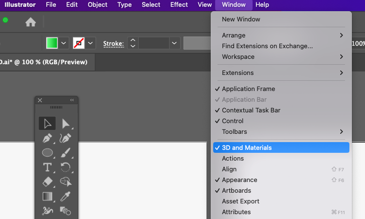 컨테이너 개체를 선택해서 일러스트레이터 메뉴바에서 Window > 3D and Materials 창을 불러온다.