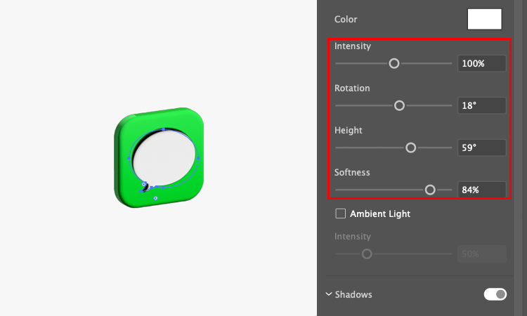 Depth는 개체의 두께의 값이다. 10px로 설정하고 나머지 옵션은 하나씩 테스트 삼아 적용해 보면 어떤 기능인지 쉽게 알 수 있다.