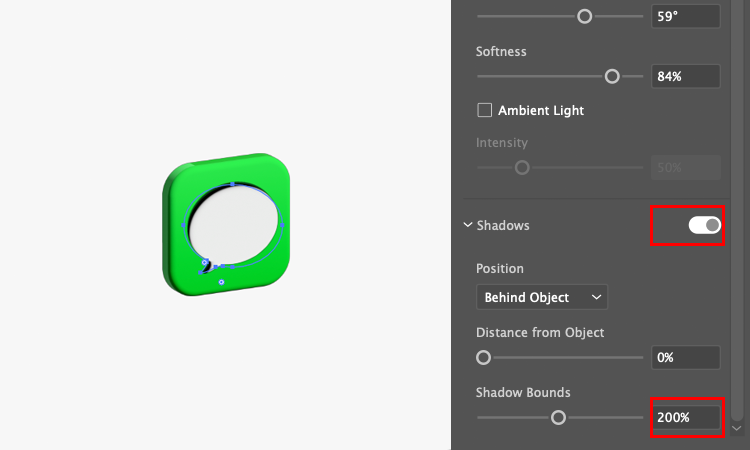 Shadow를 활성화하고 Shadow Bounds를 200%로 설정.