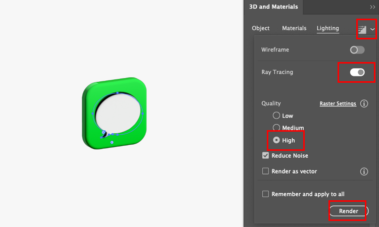 이제 3D 설정값 세팅이 끝났다. 여기서 끝이 아니라 Render를 적용해 줘야 3D 효과가 자연스럽게 적용된다. 아래 화살표를 클릭하면 Render 설정 창이 열린다. Ray Tracing을 활성화하고 Quality는 High로 설정, 그리고 마지막으로 Render를 실행해 주면 된다.