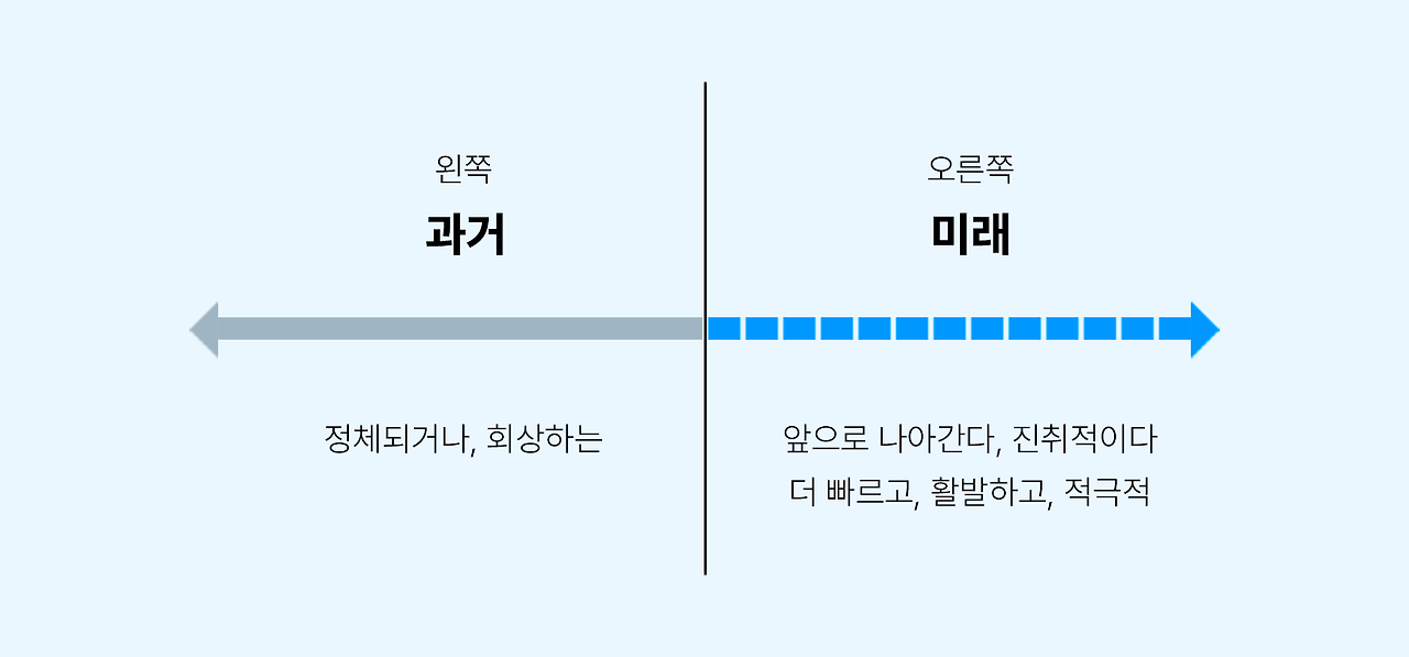 좌 → 우로 읽는 문화권 (예: 한국어, 영어, 프랑스어 등) → 왼쪽이 과거 / 오른쪽이 미래로 인식되는 경향