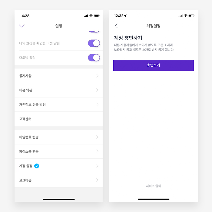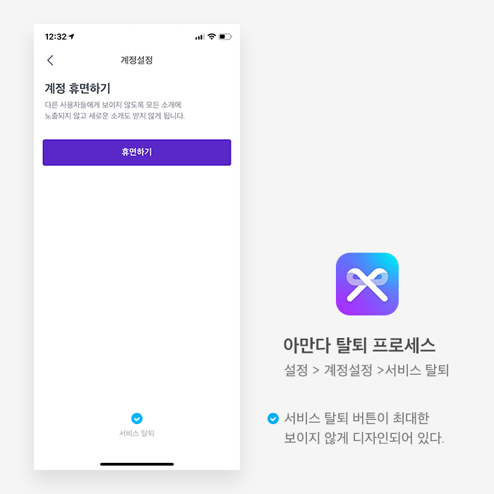혹시 이성에게 차여본 적이 있는가? 내 의지와 상관없이 이별을 통보받은 적은? 그럴 때면 상대방 마음을 돌려놓기 위해 최소한의 노력이라는 것을 한다. 대화로 상대방의 마음을 돌려놓기 위해 노력하기도 하고 또 선물 공세를 하기도 한다. 다시 말해 그 사람의 마음을 돌려놓기 위해 진심을 다해 행동한다는 말이다. 그런 진심으로도 이별을 막기란 어렵다. 이미 떠난 마음은 아무리 진심이라고 해도 돌리기 어려운 법이다. 물론 서비스를 탈퇴하는 사용자에게 이성과의 이별처럼 대응하라는 얘기는 아니다. 하지만 관계가 유지되는 것은 최소한의 노력이 있기 때문이다. 탈퇴 버튼을 눈에 띄지 않게 그리고 탈퇴하는 방식을 검색해서 찾아보도록 하는 것은 관계에 대한 최소한의 노력이 아니다. 서비스는 사용자와의 관계를 견고하게 할 때 관계에 대한 지속성이 늘어난다. 그렇다고 누구도 탈퇴하지 않는 것은 아니다. 앞에서 말했듯이 부득이하게 또는 이제 별 필요가 없어서 탈퇴하는 경우는 항상 존재한다. 그럴 때 사용자에게 탈퇴 메뉴를 꽁꽁 숨겨 놓아 불편함을 선사하기보다는 지금 당신의 상황은 모르겠지만 다시 돌아와 줄 것을 바라는 것이 사용자를 위한 최소한의 노력이 아날까 생각한다. 정말 좋은 서비스는 탈퇴율이 낮은 서비스가 아니라 재가입률이 높은 서비스다. 그런 의미로 아만다의 탈퇴 프로세스를 재구성해 보았다. '서비스 탈퇴' 버튼은 CTA로 강조, 하지만 탈퇴보다는 '계정 휴면하기'를 권장하는 것이 맞기 때문에 컬러는 '휴면하기'를 강조했다. 그리고 탈퇴의 과정을 온보딩 방식으로 굿바이 메시지를 전달한다. 메시지는 여러 가지 시나리오가 나올 수 있는 거 같다. 좋은 기억이 있는 사용자는 언젠가 서비스에 다시 돌아온다.