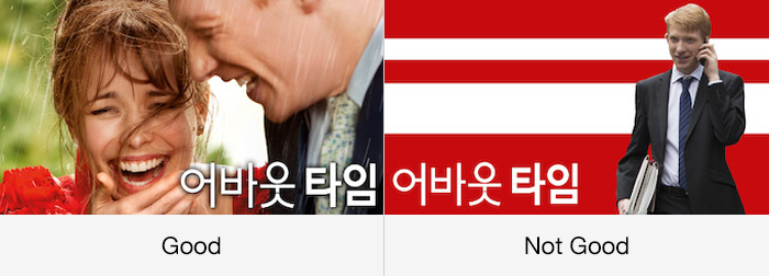 넷플릭스의 '어바웃 타임' 커버 이미지는 여러 개로 전환되며 노출되다가 현재 왼쪽 이미지로 고정 노출되고 있다. 언제 다시 바뀔지는 모르겠지만 왼쪽의 이미지가 더 매력적이다. 넷플릭스는 커버 이미지의 A/B테스트를 진행하고 흥미로운 트렌드들은 많이 발견했다고 한다. 비디오 제목의 톤을 전달하는 감정 있는 얼굴 표정 이미지가 가장 효율적이라고 말한다. (이 부분은 현지 지역에 따라 다를 수 있다고 말한다.) 테스트를 통해 넷플릭스의 제품 경험이 향상되고 사용자들이 더 빨리 비디오를 찾고 즐길 수 있도록 도울 수 있었다고 말한다.