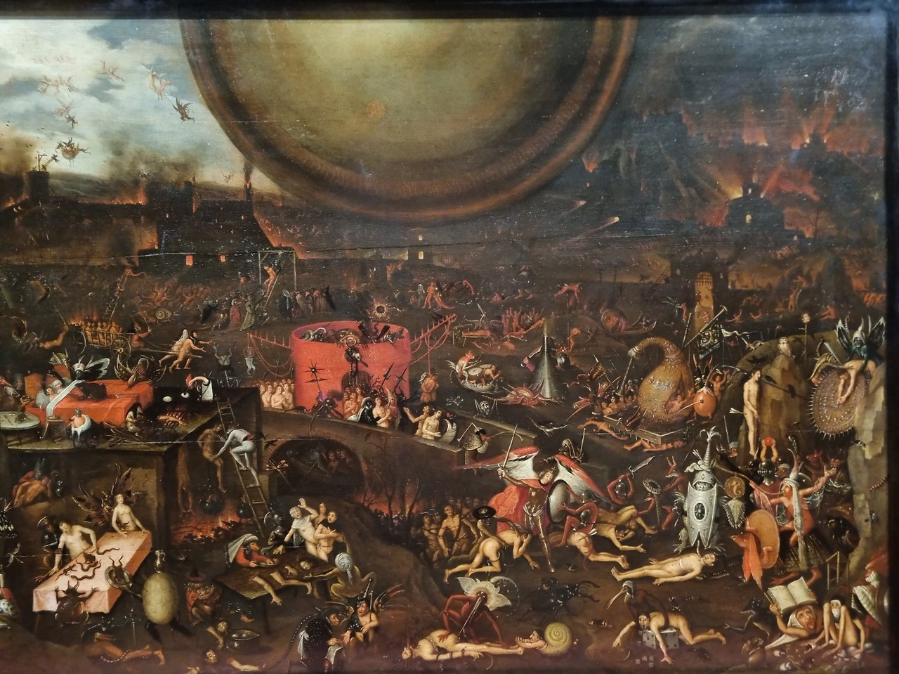 다양한 인간 군상들이 펼쳐져 있는 것 같은 그림이 보입니다. 혼잡스러운 그림을 자세히 들여다보면 살벌한 지옥의 풍경들이 펼쳐져 있습니다. 악마와 괴물, 죽음과 고통이 혼란스럽게 그림 속에 펼쳐져 있습니다. 기괴한 풍경에서 작가의 독특한 상상력이 느껴지는 한편 당대 사람들은 지옥에 대한 공포가 크면 클수록 더욱더 종교적인 가르침에 따라 살아가려고 했을 것 같습니다.