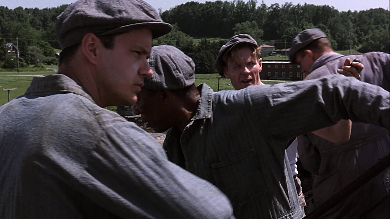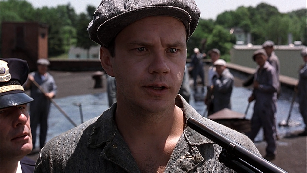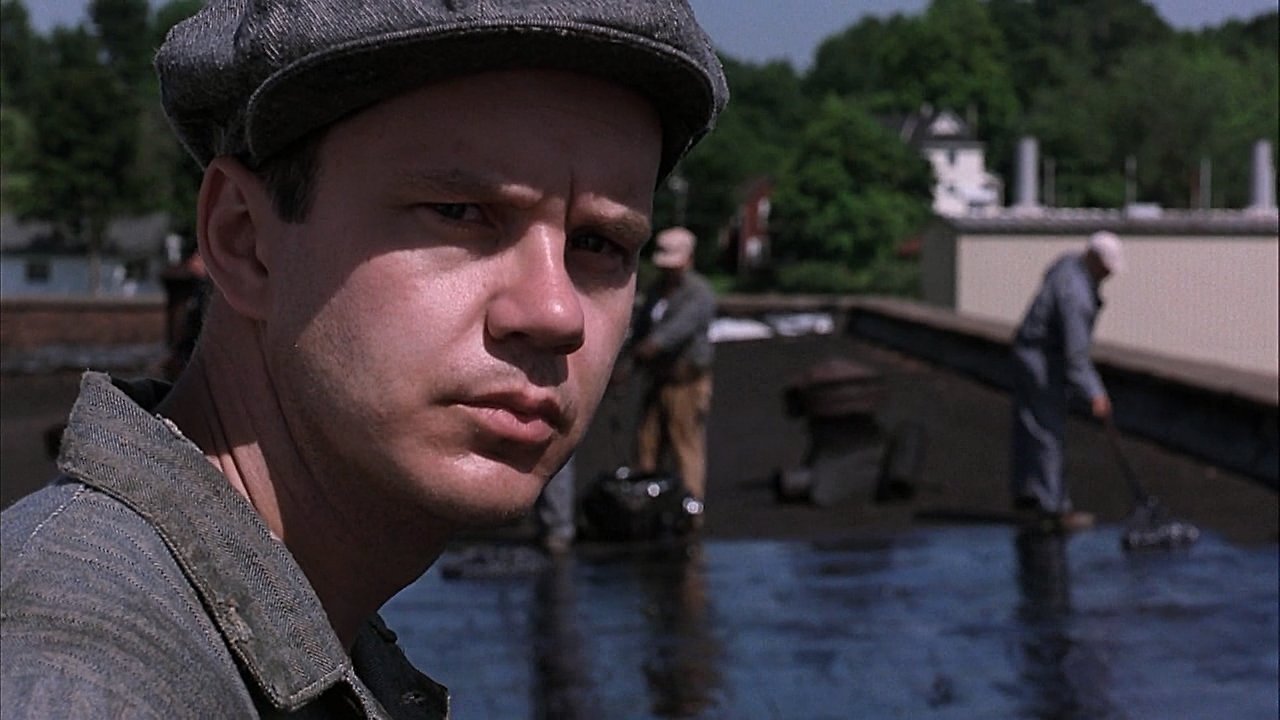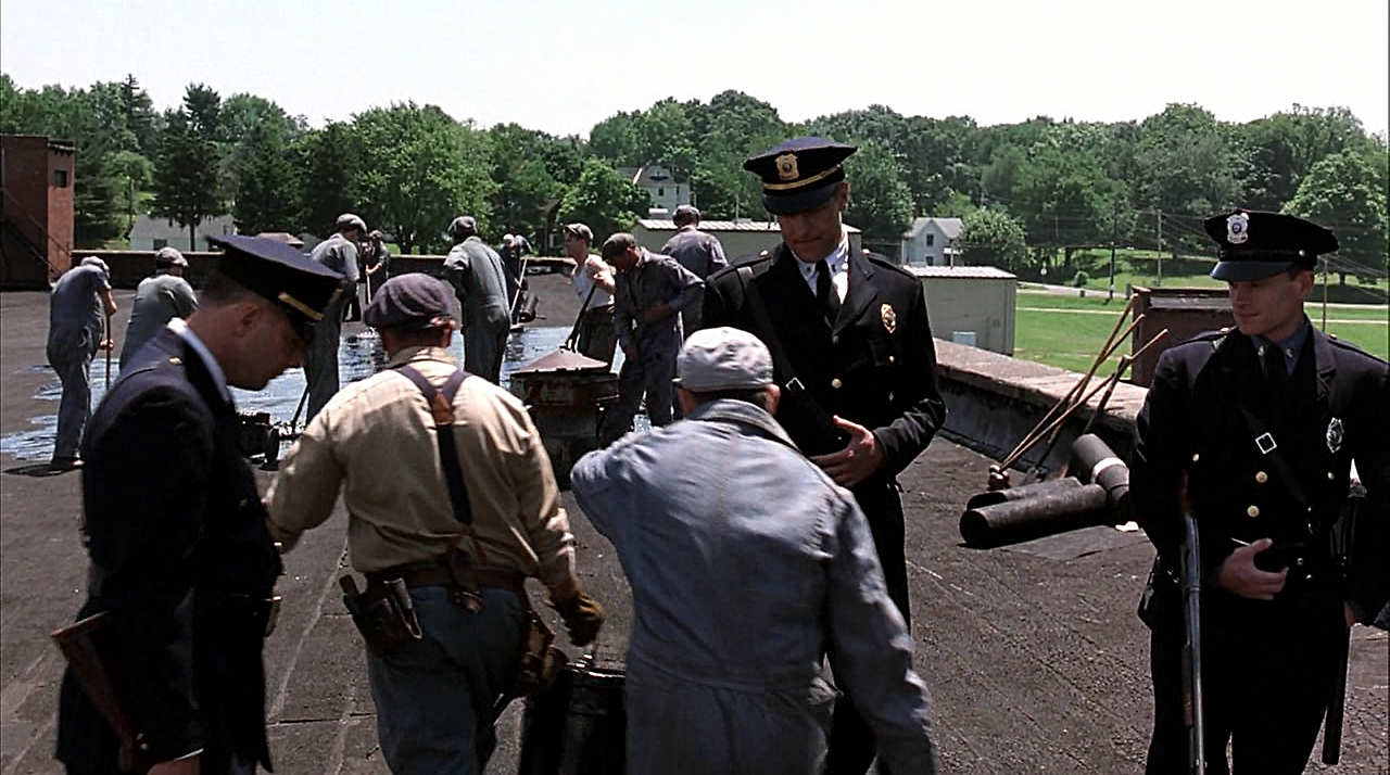 영화에는 다시 봐도 질리지 않는 인상 깊은 장면들이 많이 나옵니다. 그중 하나가 죄수들이 지붕 보수작업을 하는 장면입니다.