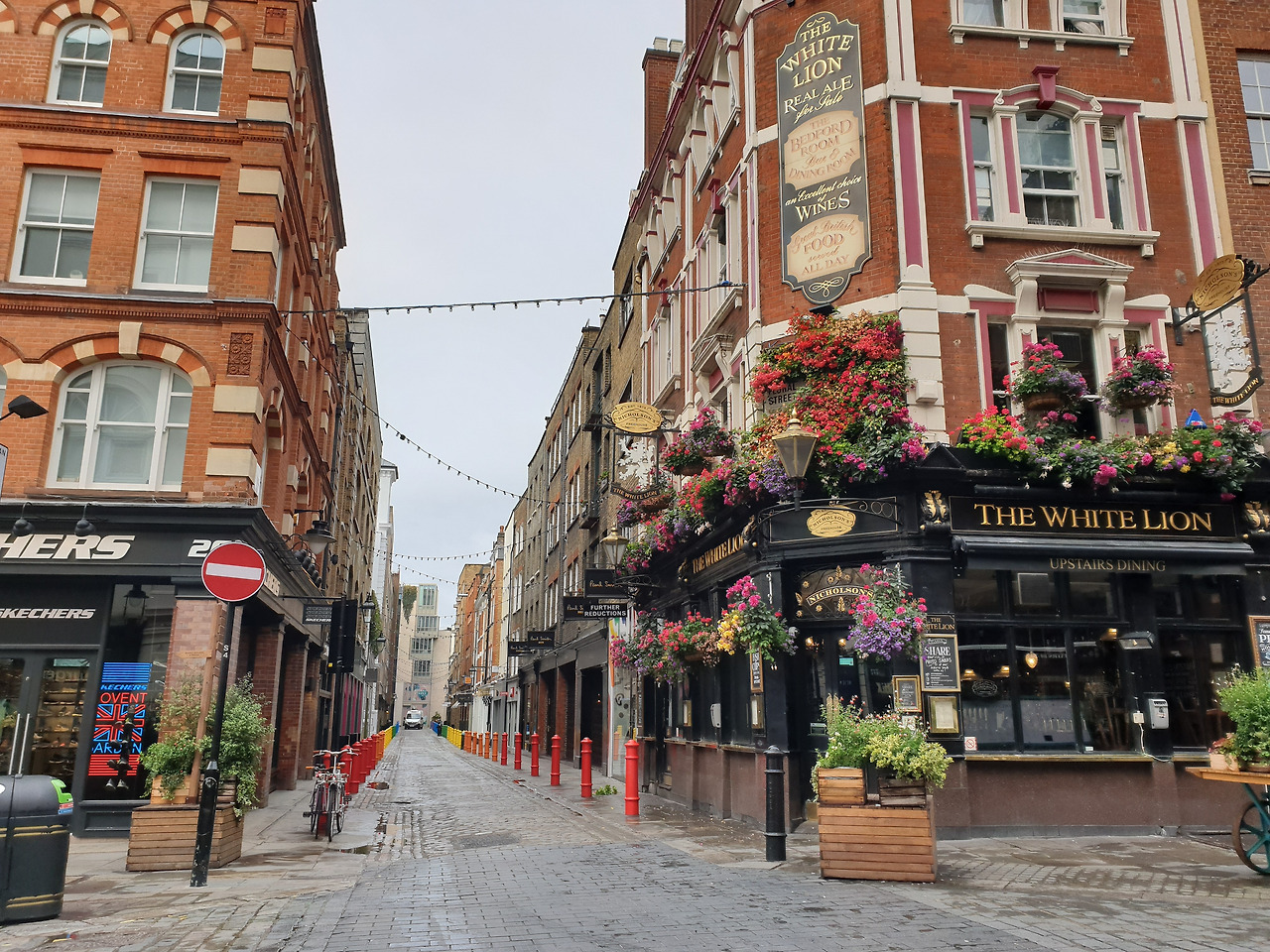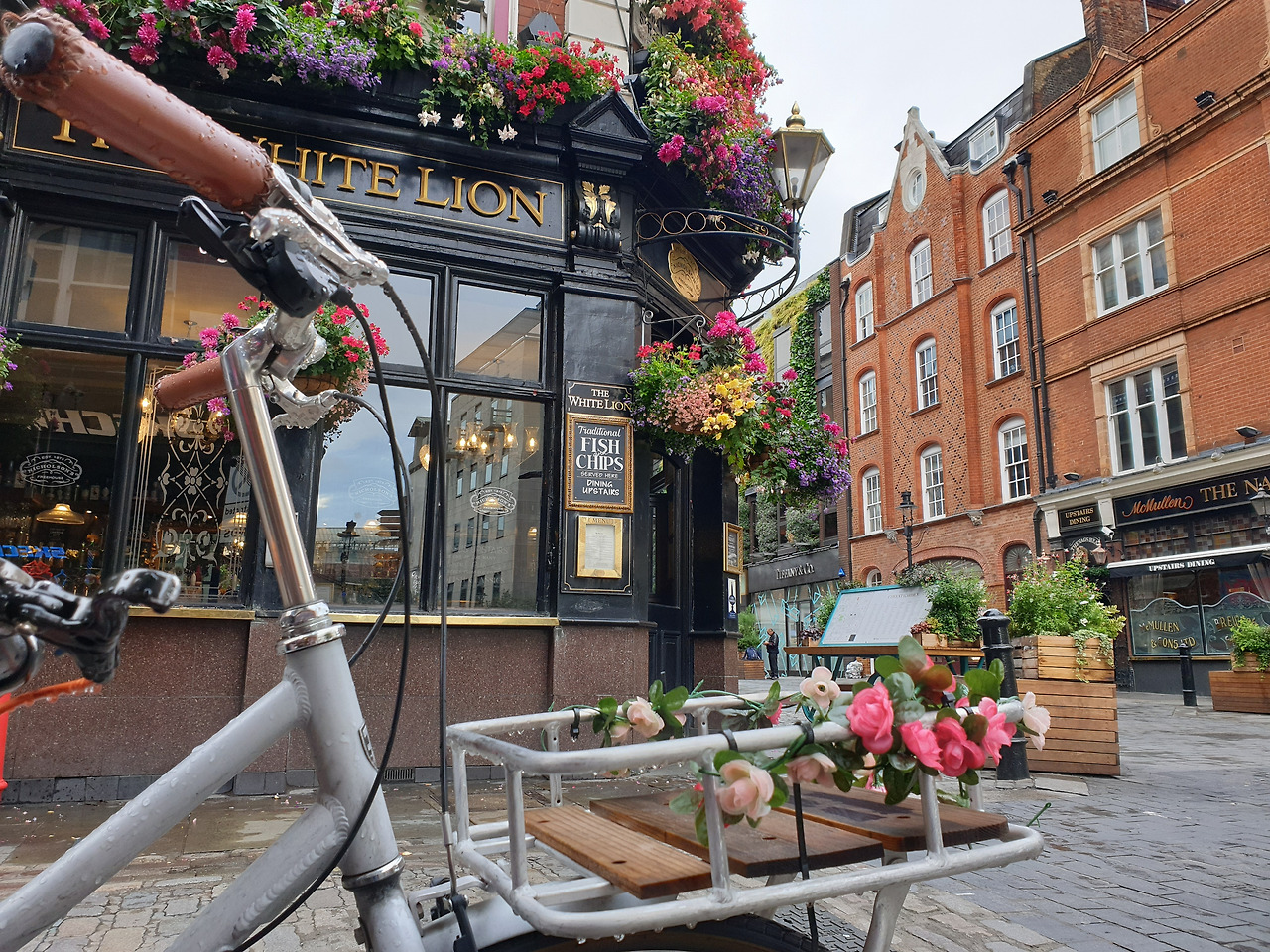 형형색색의 꽃들로 단장한 펍을 지나갑니다. 장식된 꽃들이 흐린 도시를 밝게 꾸며줍니다. 펍이 아니라 꽃집 간판을 달아놓아도 어색하지 않을 것 같습니다.