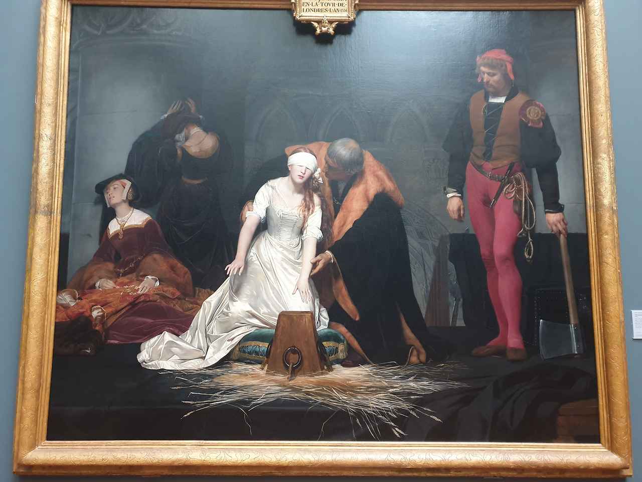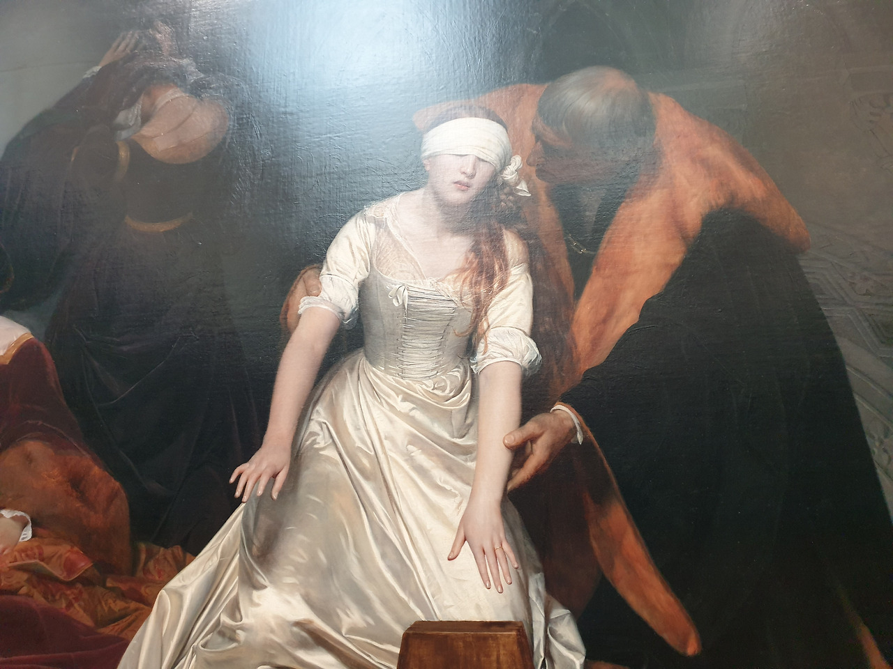당시 제인은 눈을 가린 채 있어서 처형대를 한 번에 찾지 못했다고 합니다. 그래서 손을 뻗어 처형대를 더듬어 찾아야 했고, 그때의 안타까운 이야기가 화가에 의해 표현되었습니다.