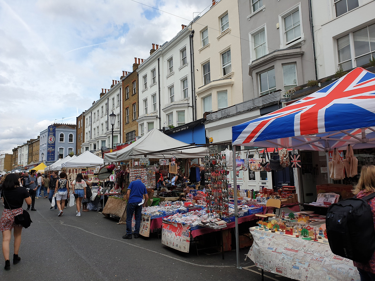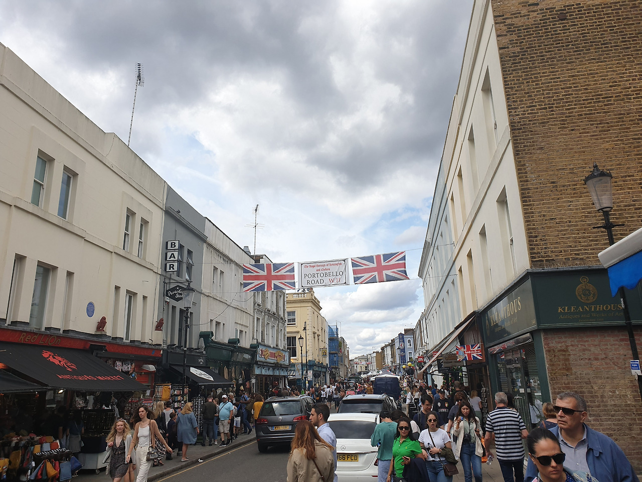 수많은 방문객들이 잡화점, 기념품점, 의류상점, 서점, 골동품 가게를 구경하며 포토벨로 마켓의 매력을 한껏 느낍니다. 날씨는 흐렸지만 영화에서처럼 거리는 활력이 넘칩니다.