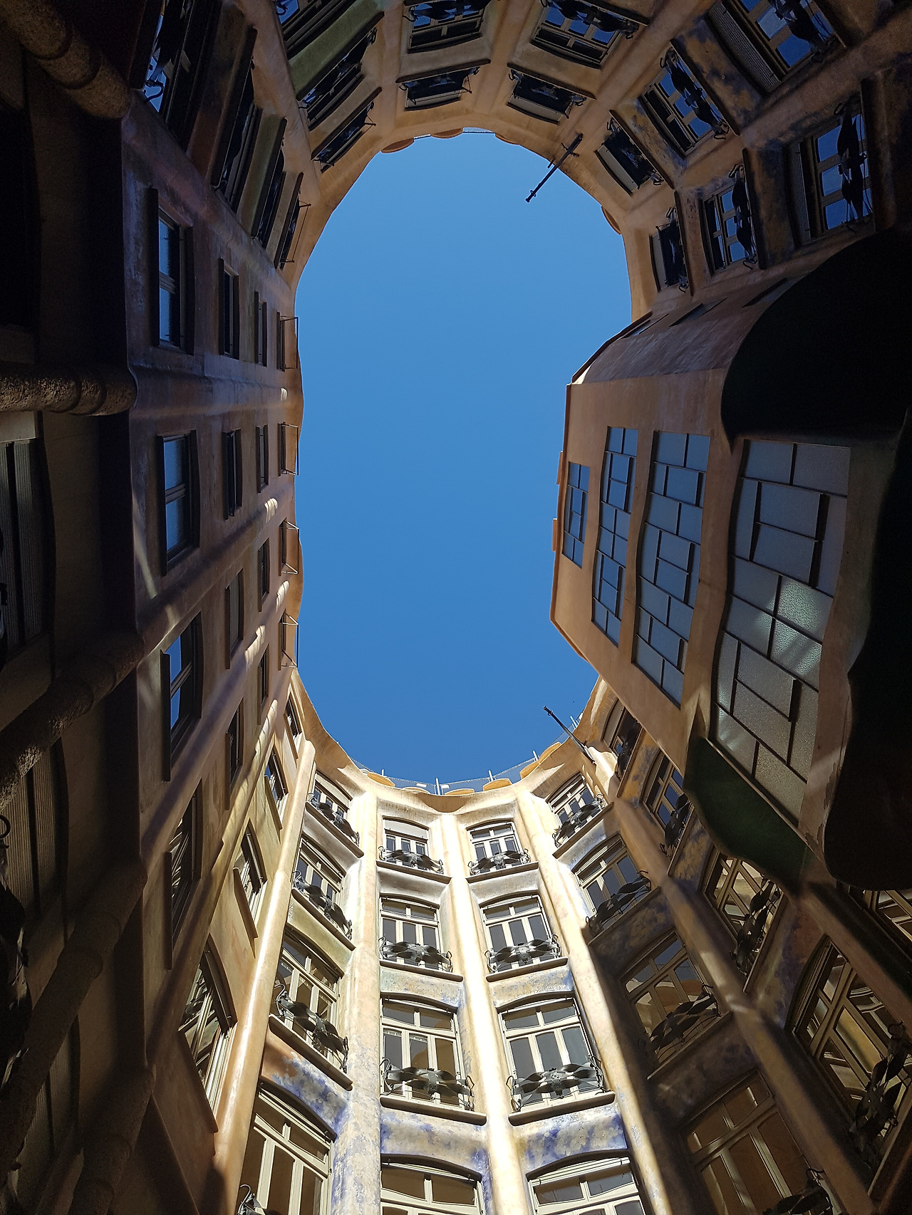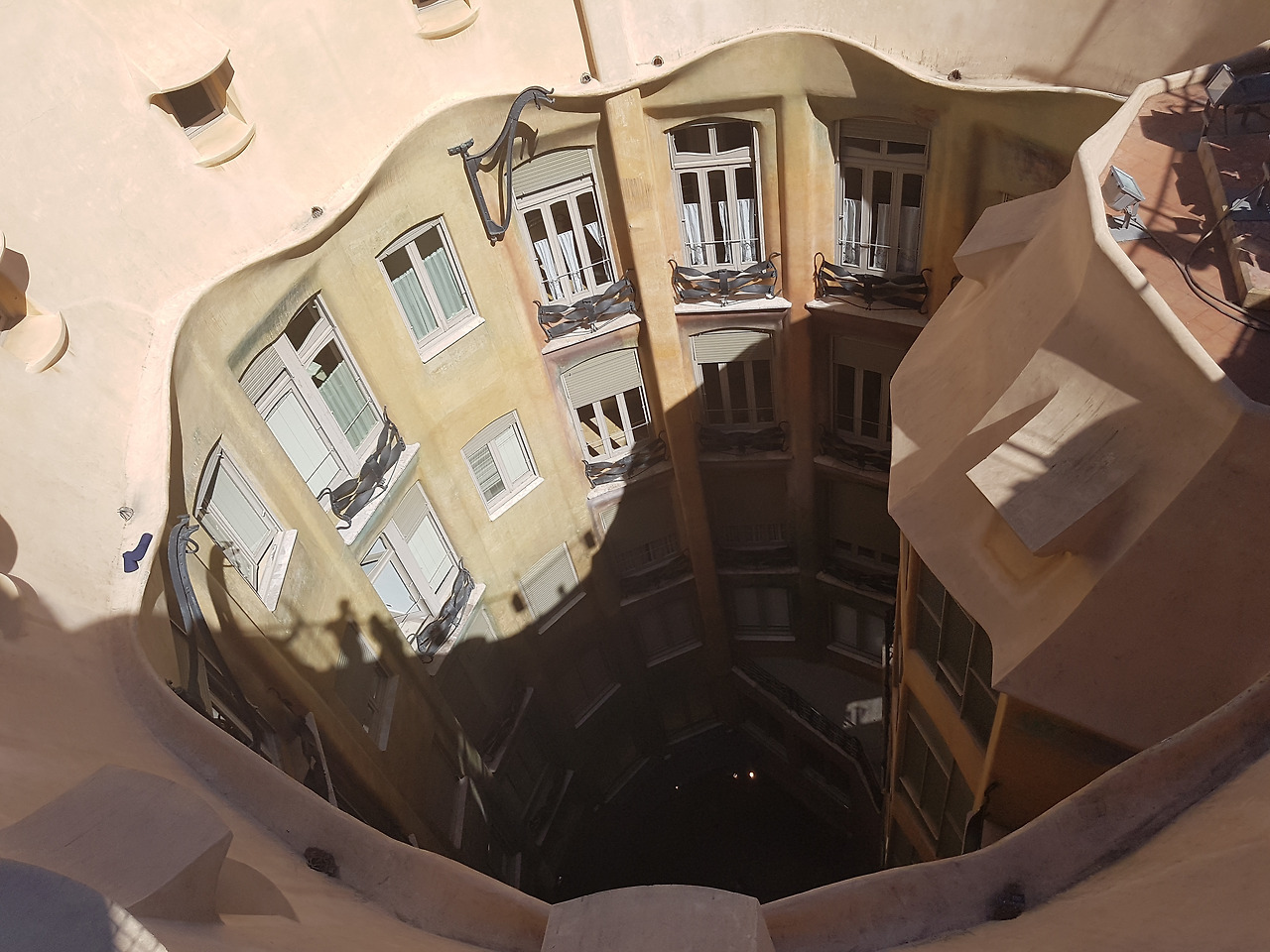 까사 밀라 내부를 들어가 보면 가운데가 뻥 뚫려있는 건물임을 알 수 있습니다. 덕분에 건물 내부까지 밝은 햇살이 잘 들어오는 구조가 되었습니다. 아마 가우디는 햇살을 대단히 좋아하는 사람이었음이 분명해 보입니다.