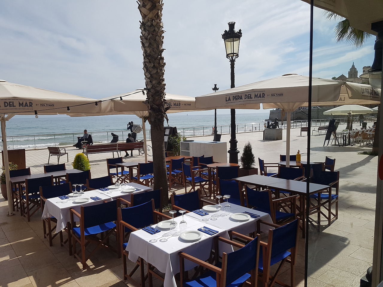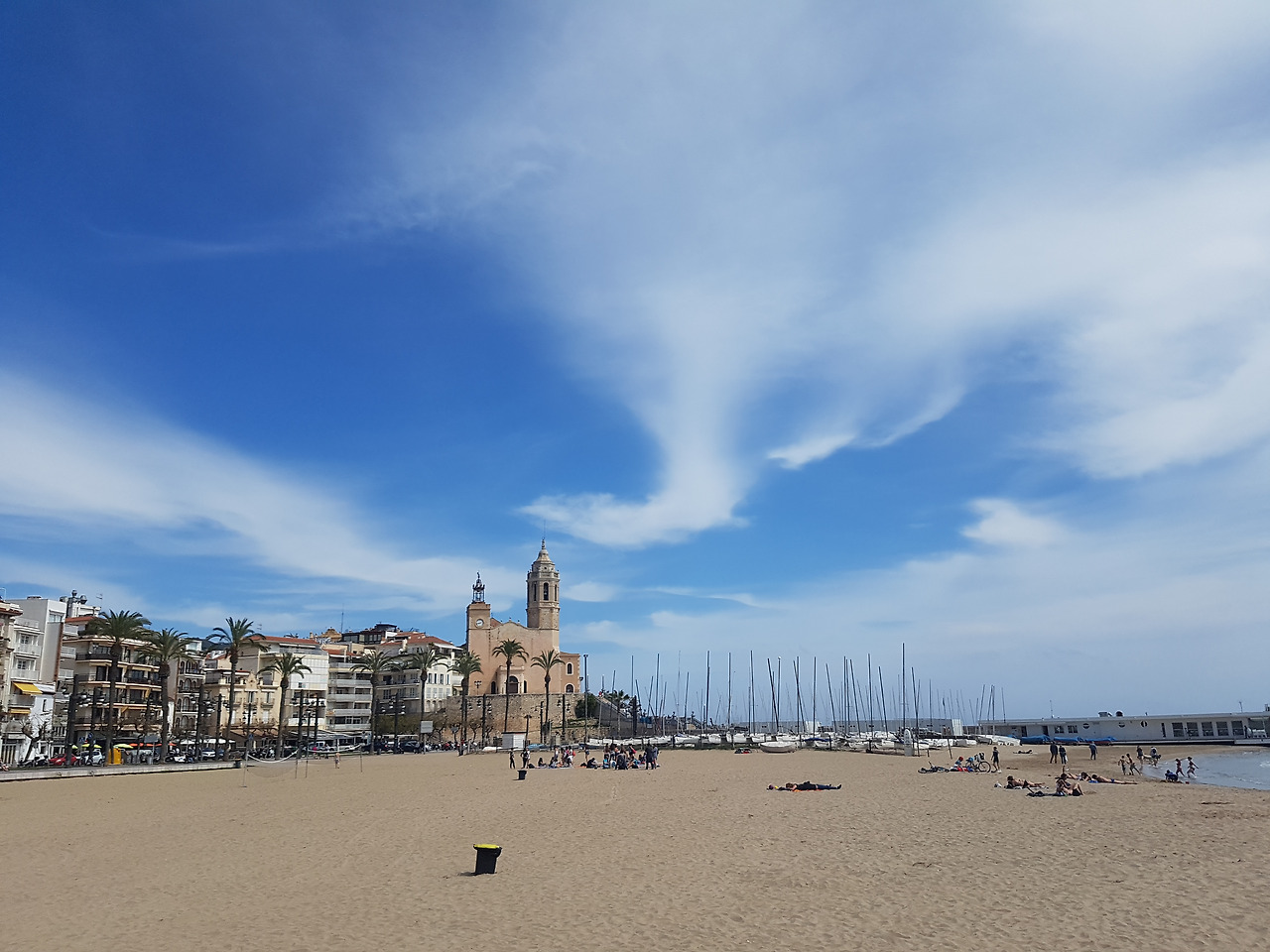 파란 하늘 아래 한적한 시체스 해변이 펼쳐져 있습니다. 여유롭게 일광욕을 하는 사람들, 차가운 물에 발만 살짝씩 담가보는 사람들이 드문드문 보입니다.