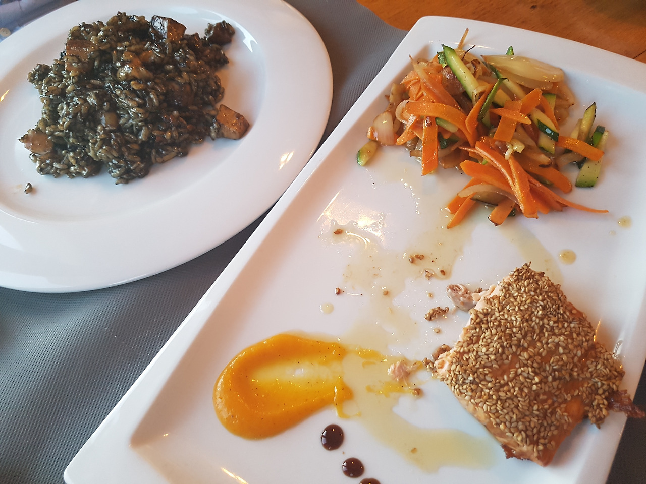 근처 식당에 저녁을 먹으러 갔습니다. 메뉴는 먹물 빠에야와 연어 스테이크입니다. 식당 분위기도 좋았고 상당히 만족스러운 식사였습니다. 스페인에서는 다행히 음식으로 불만족했던 때가 없었습니다.
