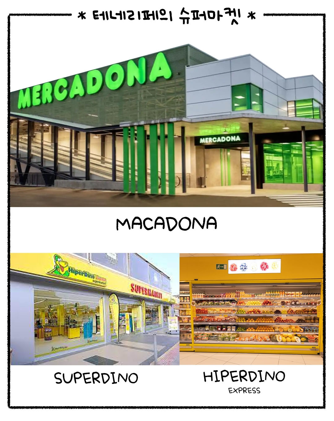 테네리페에는 스페인에서 가장 유명한 슈퍼마켓인 MACADONA(코스트코만큼 엄청 큼), 그리고 카나리아 지역에만 있는 SUPERDINO가 있습니다. 아데헤는 관광객들이 많이 찾는 곳으로 호텔과 콘도가 모여있는 곳에 슈퍼마켓은 대부분 현지 물가에 비해 2배 정도 비쌉니다. 음식을 해 드실 생각으로 장을 많이 보실 생각이라면 이 두 곳에 차를 가지고 가시는 것을 추천드립니다. 테네리페에 방문하는 분들이 대부분 차를 렌트하기 때문에 가족 단위로 가셨거나, 콘도에서 음식을 계속 해드실 거라면 여기를 추천드립니다.