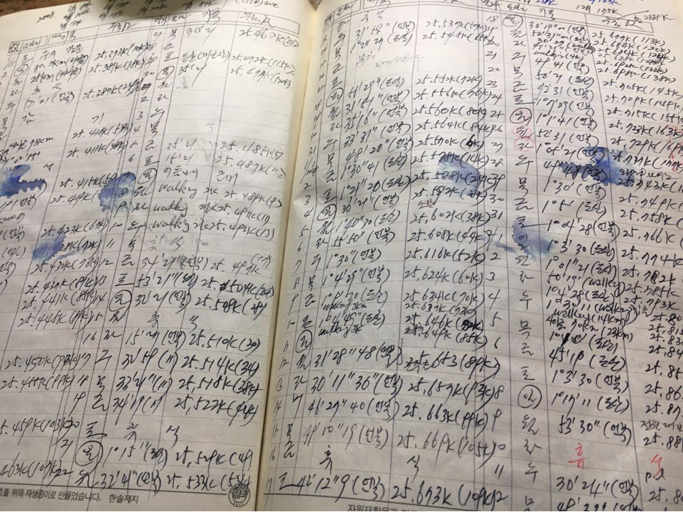 이번에 집에 와보니 탁자에 못 보던 공책 세 권이 있었다. 평소 같았으면 신경 안 썼겠지만 공책들이 헤질 대로 헤져 종이 낱장들을 붙잡아주지 못할 정도였다. 궁금해서 펼친 공책에는 아빠가 매일 달리기를 하던 기록들이 한 줄씩 적혀 있었다. 1993년, 누나가 태어난 해부터 시작된 아빠의 달리기 기록은 불과 엊그제까지 계속되고 있었다. 달리지 못하는 날에는 감기몸살, 무릎 부상 등 사유를 명확하게 적어놓으신 채.