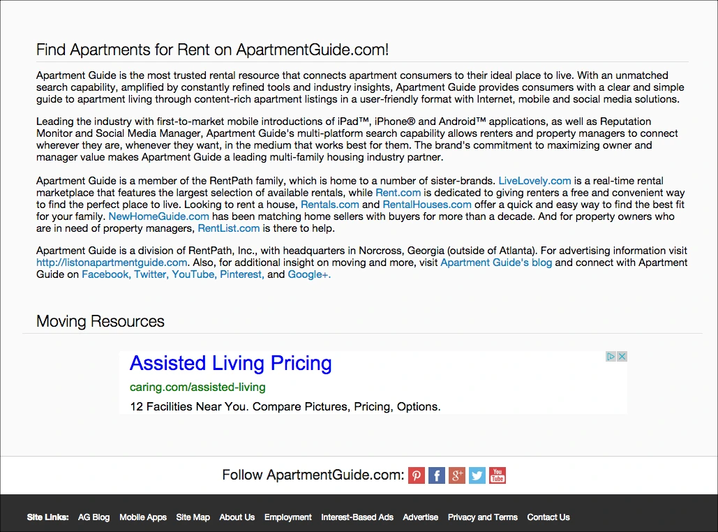아파트먼트가이드 웹사이트의 경우 제목과 본문의 명확한 구분이 가지 않습니다. 본문 또한 길이가 길며 핵심 키워드가 강조되어 있지 않습니다. 닐슨 노먼 그룹에서 해당 페이지를 사용자 인터뷰한 결과 “많은 글이 있어 지저분해 보이며, 읽고 싶은 마음이 들지 않는다”라는 피드백을 받았습니다.