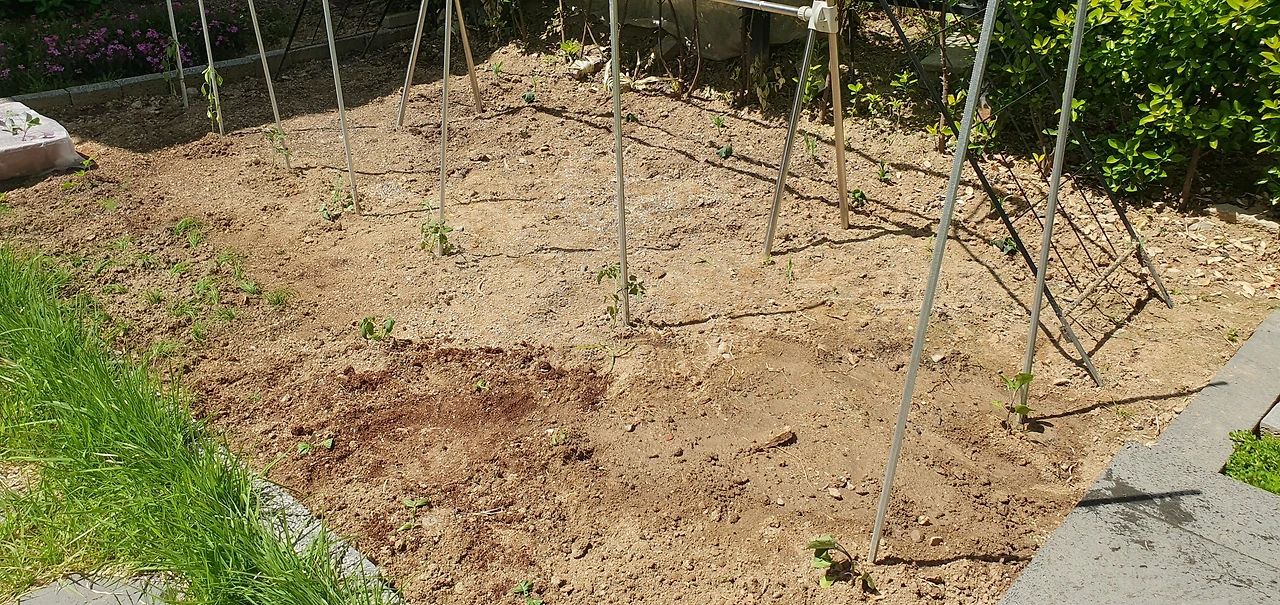 무려 이틀이나 모종을 텃밭에 방치했다. 뜨거워지는 날씨에 더위를 고추 모종은 더위를 먹은 듯 누래져서 얼른 심기로 했다. 나중에 따 먹기 쉽게 키순으로 심기로 했다. 키가 큰 고추, 방울토마토, 가지는 멀리 심고, 키가 작은 케일, 바질, 당귀, 부추, 아스파라거스는 앞 쪽에 심었다. 올해가 벌써 텃밭 3년째라 경험이 쌓였다. 고추, 방울토마토, 가지는 지지대를 미리 세웠다. 간격은 넓게 더 넓게 벌렸다. 예전에는 잘 모르고 가깝게 많이 심었는데, 방울토마토가 워낙에 덩굴져서 자라서 서로 엉켜 열매 수확도 못해서 결국 옮겨야 했고, 고추는 장마에 습할 때에는 통풍이 안돼서 벌레의 온상이 되어 뽑아 냈다. 사람들이 지나다니고 손을 넣을 수 있어야 수확도 가능하다. 지지대를 최대한 힘줘서 깊게 박고, 아직은 키가 작아서 묶는 것도 힘들지만 줄기와 묶어서 고정했다.