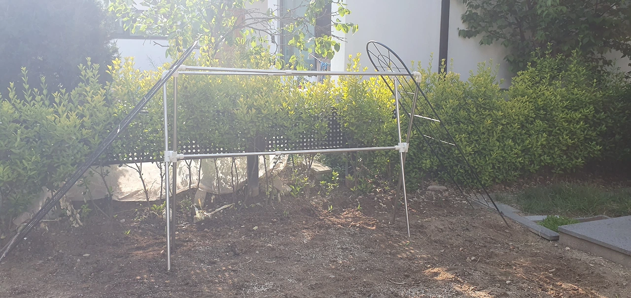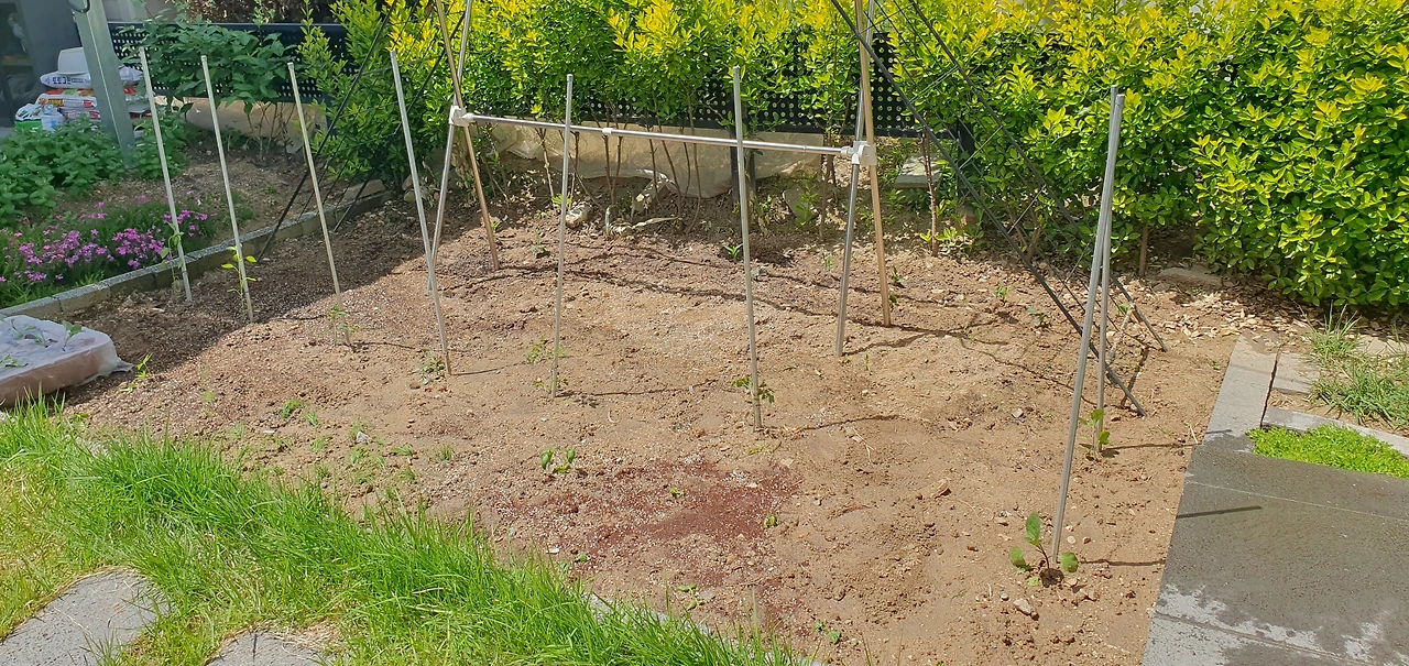 모종 쇼핑이것저것 사들고 온 정원 한쪽 텃밭은 왠지 막막한 기분이다. 거름을 세 번이나 섞어서 지렁이들로 우글거리는 텃밭을 괜해 호미로 뒤섞어봤다. 일단 모종은 텃밭 한편에 던져 놓았다. 한 번 심으면 1년 동안 그 자리를 지키기에 관리하기 편리하게 심어보고 싶었다. 모종 심기 첫 타자로 옥수수와 해바라기를 집어 들었다. 옆집과 경계를 따라 쭉 심었다. 키가 커서 사생활 보호를 해 볼 심산으로 심었다. 그리고 오이이 지지대를 설치했다. 겨우내 정원 구석에서 놀고 있던 이불빨래 대을 텃밭으로 옮기고, 안 쓰는 장미 휀스도 뽑아다가 덧대어 놓으니 모양새가 합체로봇 같이 생겼다. 6개의 오이를 태울 지지대가 완성됐다.