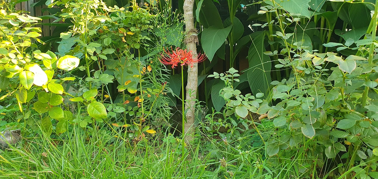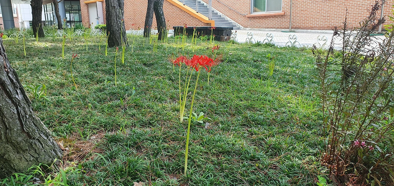2년 전에 심어놓은 꽃무릇이 나타났다. 2년간 꽃을 못 봐서 포기했는데, 끈질긴 딱 한 송이가 우뚝 솟았다. 한껏 하늘로 치솟아 오른 속눈썹처럼 빨간 꽃송이가 도도하다. 놀라고 예뻐서 눈을 뗄 수 없다. 꽃무릇은 구근 식물이라 땅속에 구근이 크다. 특이하게 줄기와 꽃이 먼저 폈다 쓰러지고 나면 잎이 자라난다. 2년간 전혀 존재를 표현하지 않다가 갑자기 나타난 완벽한 등장에 깜짝 놀라고 기뻤다. 튤립, 백합처럼 구근 식물은 이렇듯 등장과 사라짐을 반복하며 사람을 즐겁게 한다. 정원을 무대 삼고 계절의 지휘 아래 맘껏 연기하는 배우들 같다.