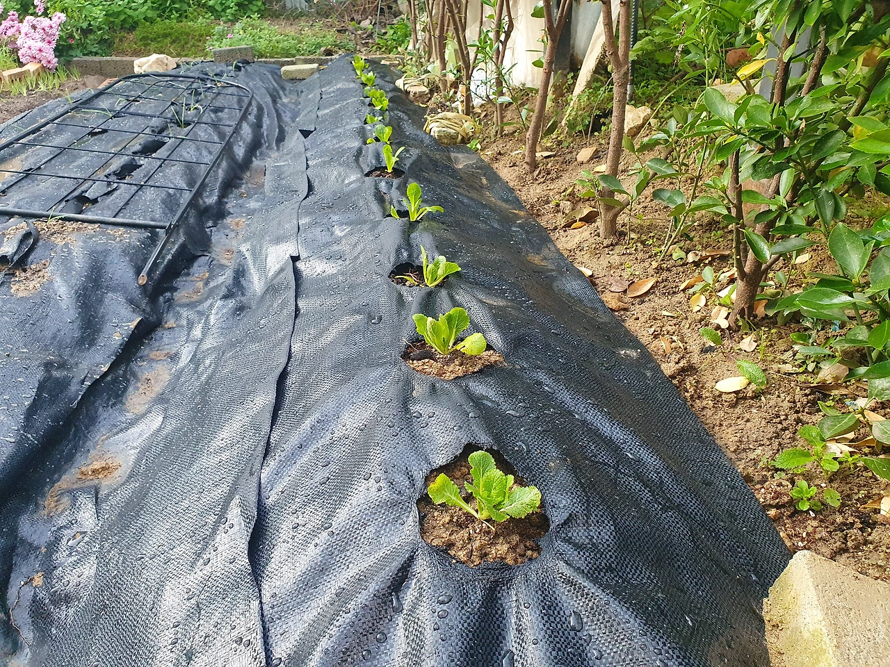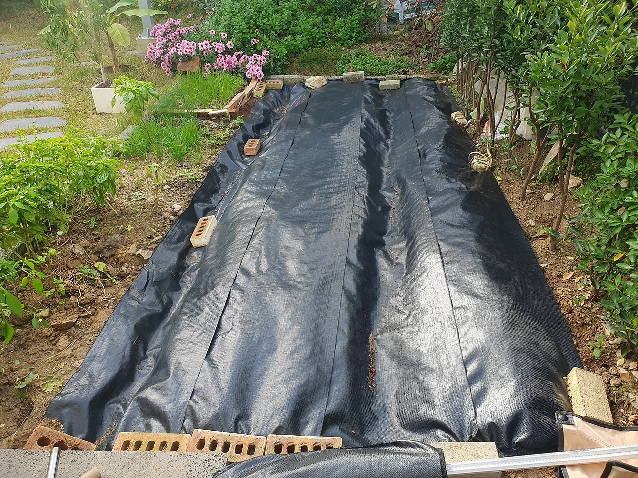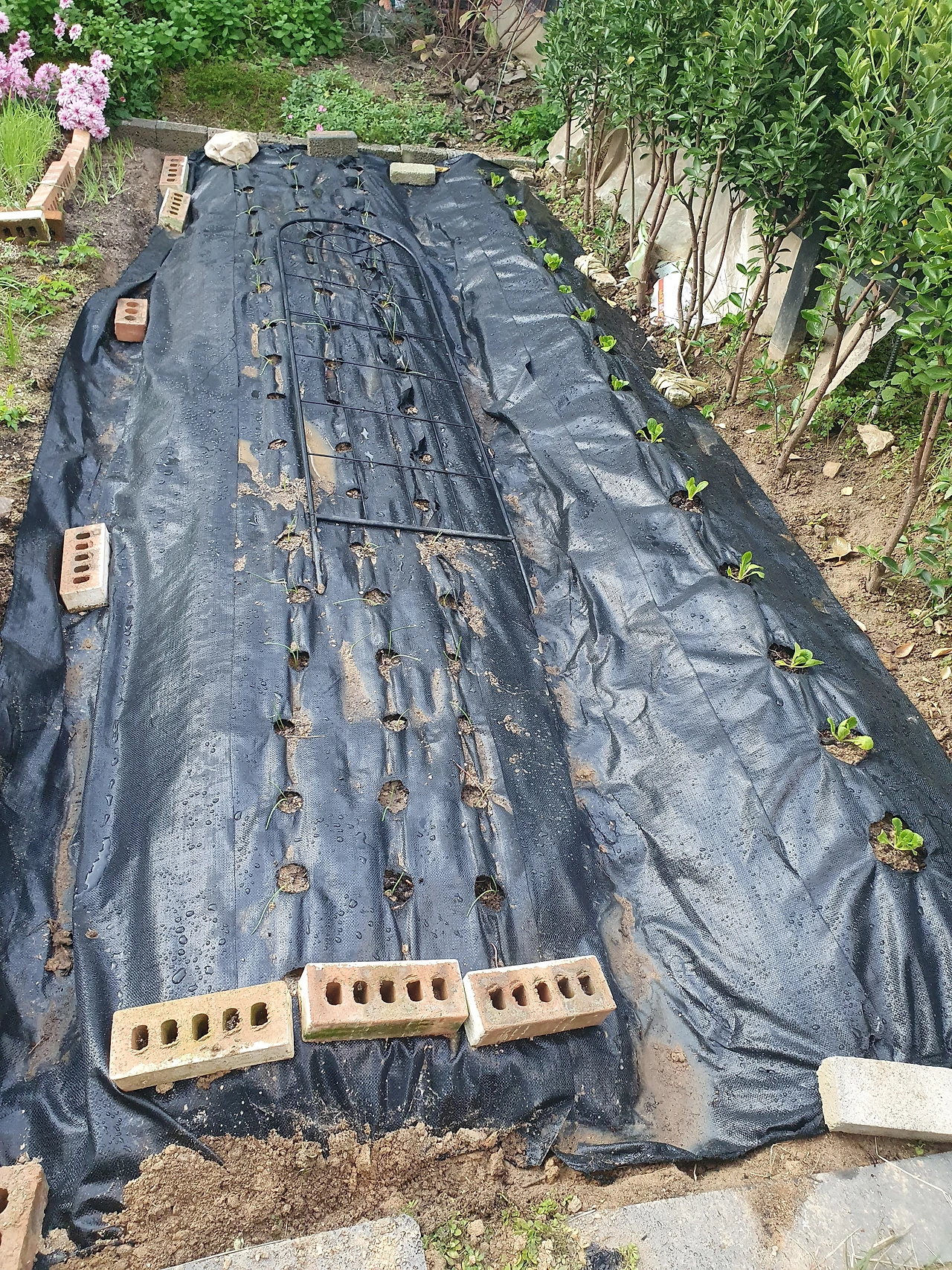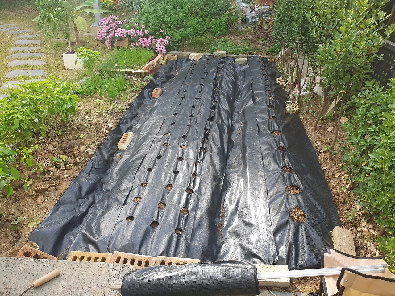 여기 까지는 항상 하던 일이었는데 올해는 특별히 제초매트를 깔았다. 소위 멀칭이라고 하는 땅을 덮어주는 작업이다. 이런 것 없이도 3년 살았지만