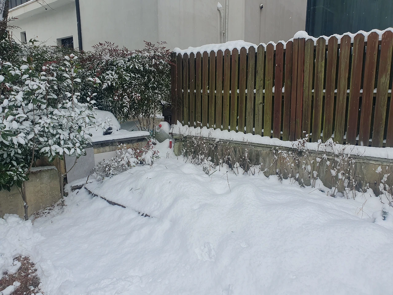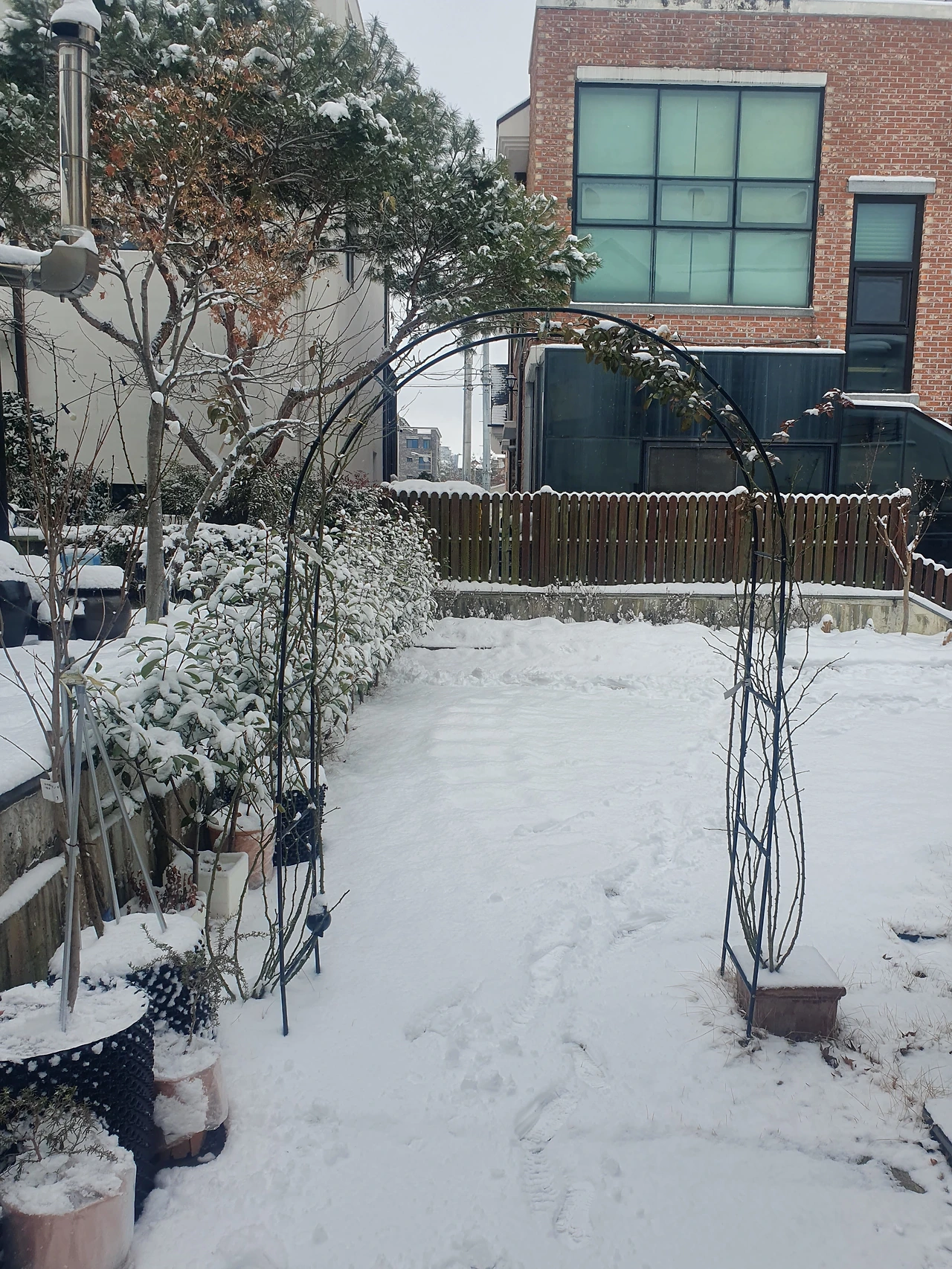고요한 겨울 마당에 해줄 것은 없고, 고양이 똥만 치우러 가끔 갈 뿐이었는데 눈이 많이 온김에 한번 살펴 보게 되었다. 정원에서 나와 노는 일이 없던 아들이 눈 위에 누워서 신나게 놀았다. 추워서 온 눈인데 하이얀 풍경에 따뜻하다는 착각이 들기도 하다.