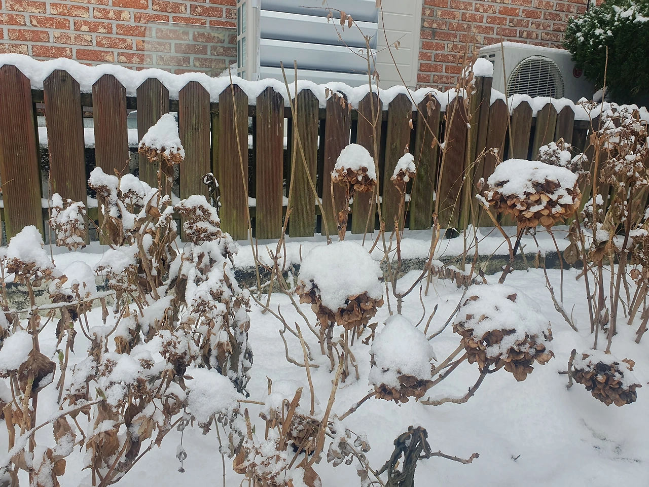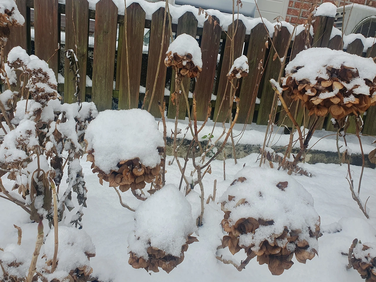 집 앞 길에 눈을 밀고, 차 위의 눈도 털고, 화분 위에 쌓인 눈도 털었다. 화분 안에 얼음이 얼어 장미와 로즈마리가 죽을까 무섭다. 우리 집 나무가지는 눈도 쌓이지 않을만큼 앙상하다. 마른 수국 꽃 위에도 눈이 쌓였다. 내가 기다리던 수국에 눈 쌓인 풍경을 드디어 보았다.
