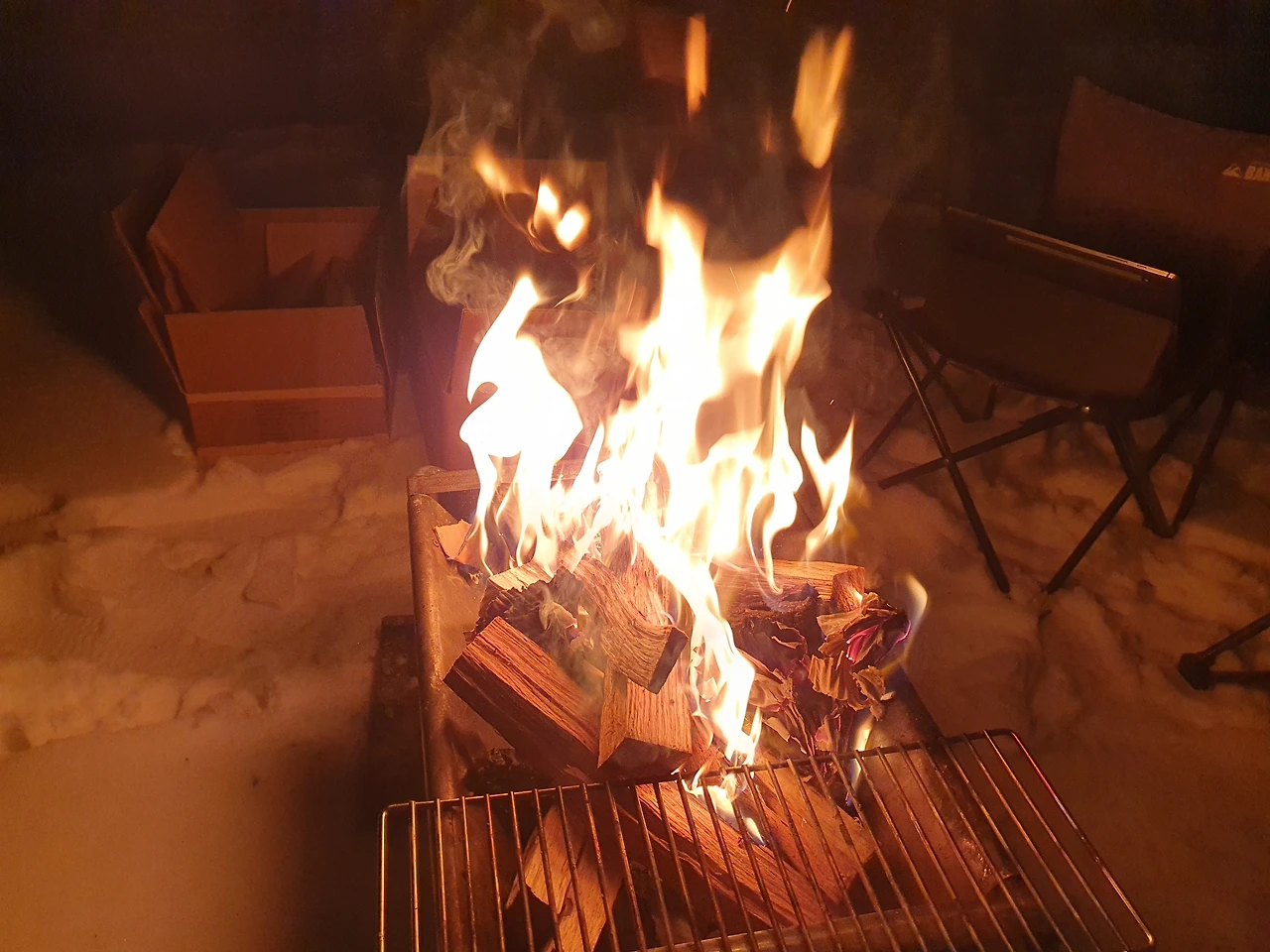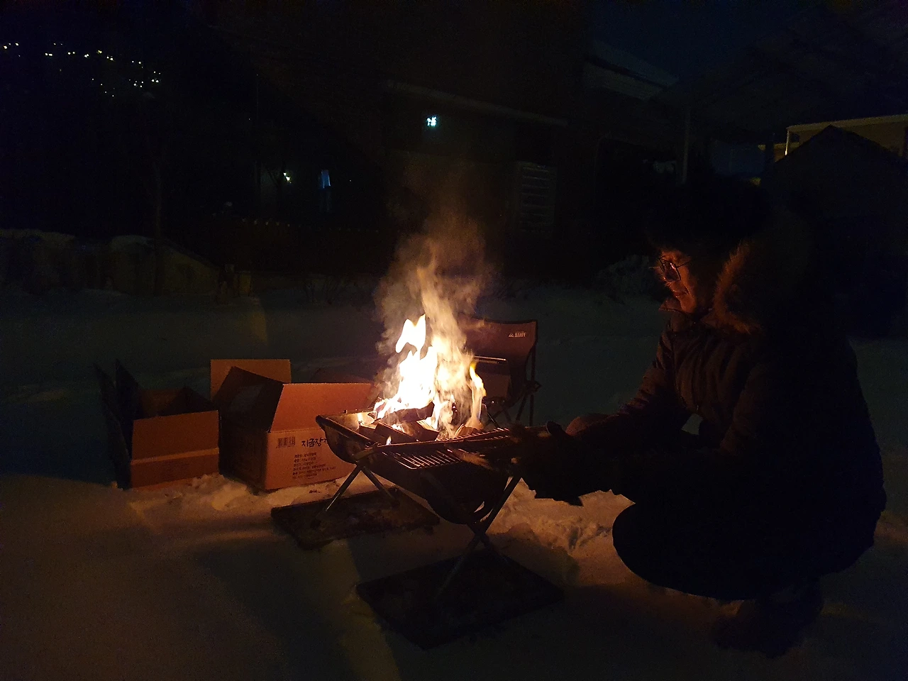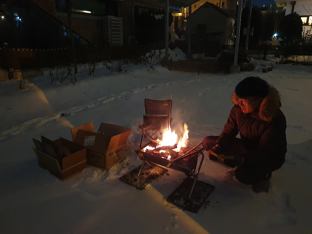 구정에 눈이 펑펑 왔다. 오랜만에 모인 가족들과 TV를 보니 "캠핑의 꽃은 겨울캠핑"이라고 했다. 겨울에는 추워서 밖에 나가기도 힘든데 무슨 말인가 싶었다. 뭐가 좋다는 건지 알아 볼 겸 계획에도 없었던 불멍을 하기로 했다. 마트에서 가리비와 맥주를 샀다. 구정을 맞아 내려온 어머니와 도련님도 추워서 나오기 싫어했다. 그렇게 춥고 까만 겨울밤, 장작불을 지피기 시작했다.