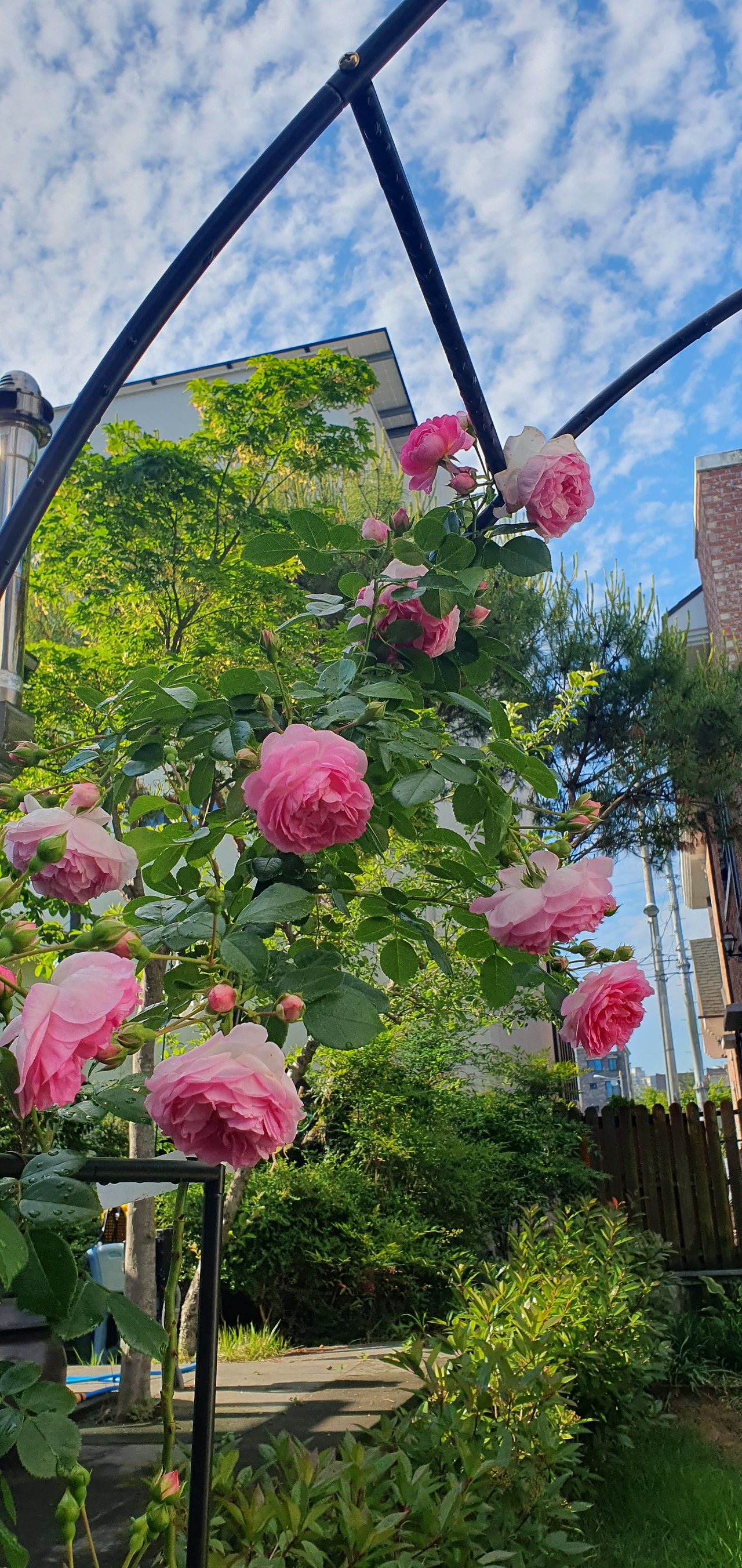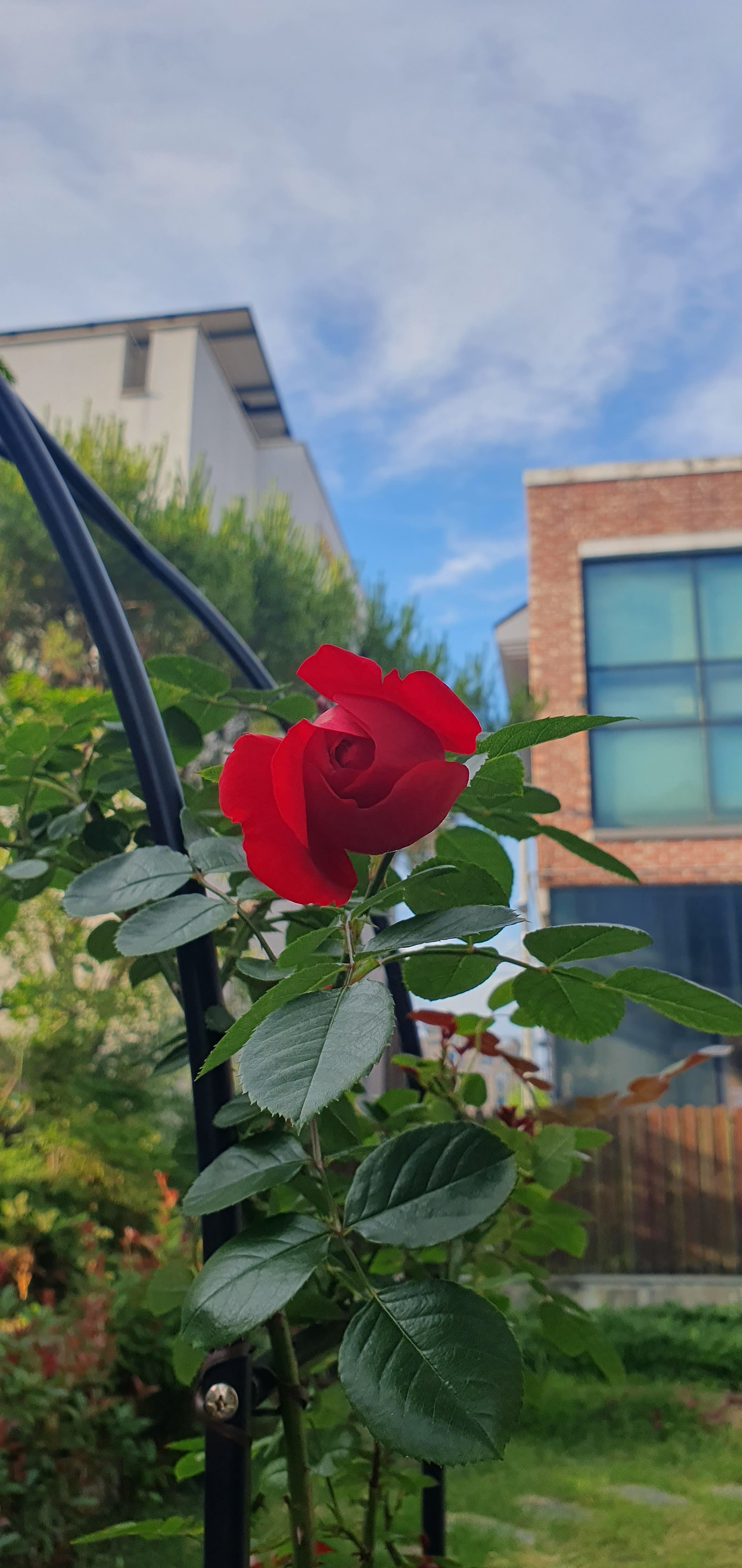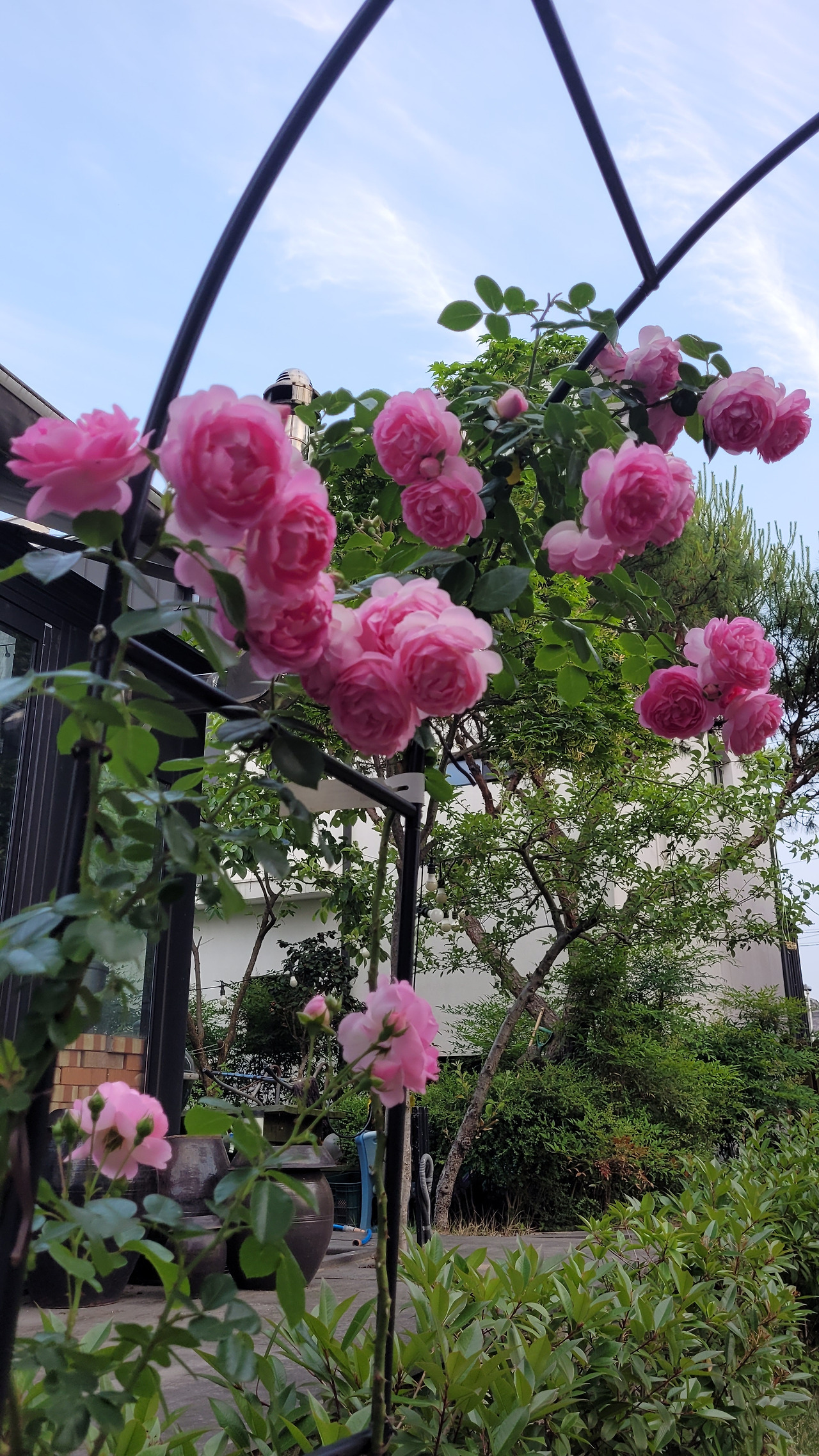 5월보다 조금 늦게 붉은 장미도 꽃을 피워내기 시작했다. 줄기부터 검은색이 돌더니 붉은 꽃이 폈다. 꽃이 매우 크고 색이 또렷한 빨강이었다. 처음 약했던 모습은 온 데 간데없고 옮긴 후로는 수세가 정말 강하다. 굵은 줄기가 쭉 뻗어 나왔다. 계속 줄기를 아치에 묶어줘야 했다. 화분에 심었는데 화분 밑구멍으로 땅바닥으로 깊게 뿌리를 내렸다. 강한 빛을 온몸으로 빨아들이고 기다렸다는 듯이 무서운 성장을 보여줬다. 병충해도 없고 꽃도 계속 피우는 정말 강한 장미였다.