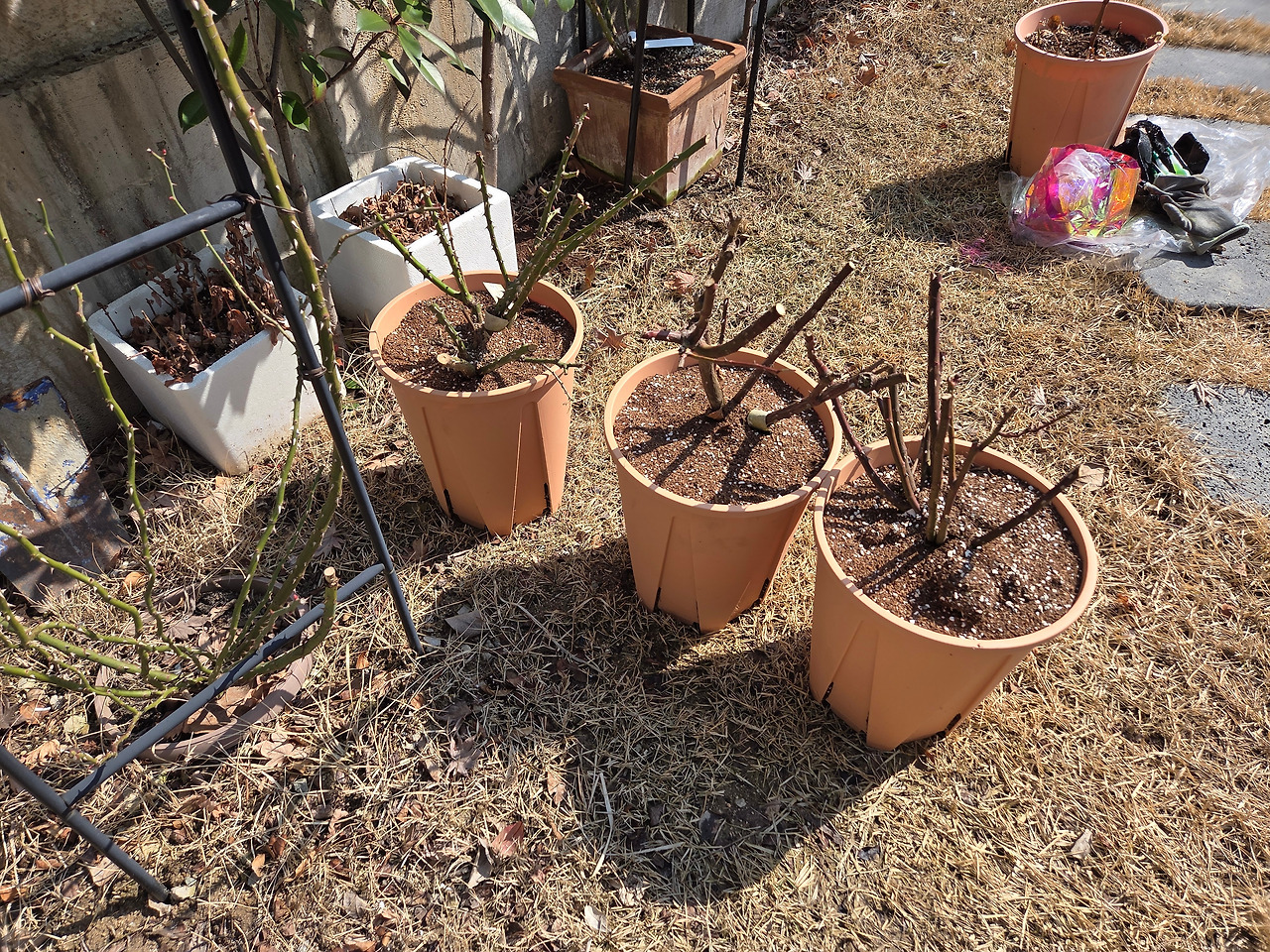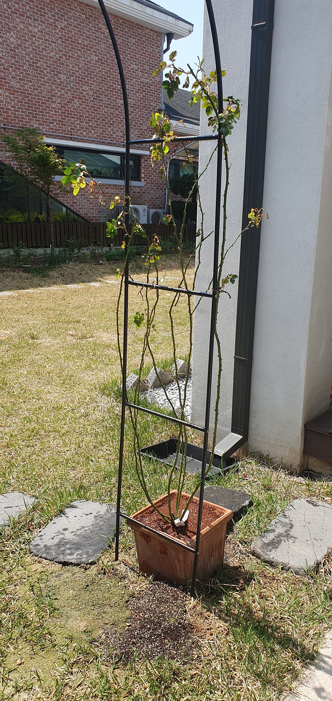 내 인생 첫 장미에 첫 꽃인 데 이렇게 허망하게 보낼 수 없었다. 4월 마지막 날인데도 이웃집의 성질 급한 장미는 한두 송이 벌써 꽃피기 시작했다. 단풍나무를 급하게 가지치기해서 장미에 빛이 가도록 했다. 그래도 웃자람이 나아지지 않자 화분으로 옮겨서 빛이 잘 드는 곳으로 옮겼다. 덩굴장미는 죽음을 기다리느니 양지바른 야치로 옮겨야겠다고 결심했다. 빨간 장미를 휀스에 묶은 끈을 풀고 정성껏 심어놓은 장미 뿌리를 다시 퍼냈다. 분홍 장미 아치의 비어 있는 반대편으로 자리를 옮겼다. 빨간 장미의 쪼글 해진 줄기와 시들한 잎사귀가 새 자리에서 회생하기를 바라며 거미줄과 시든 잎을 떼내고 물과 비료를 줬다.