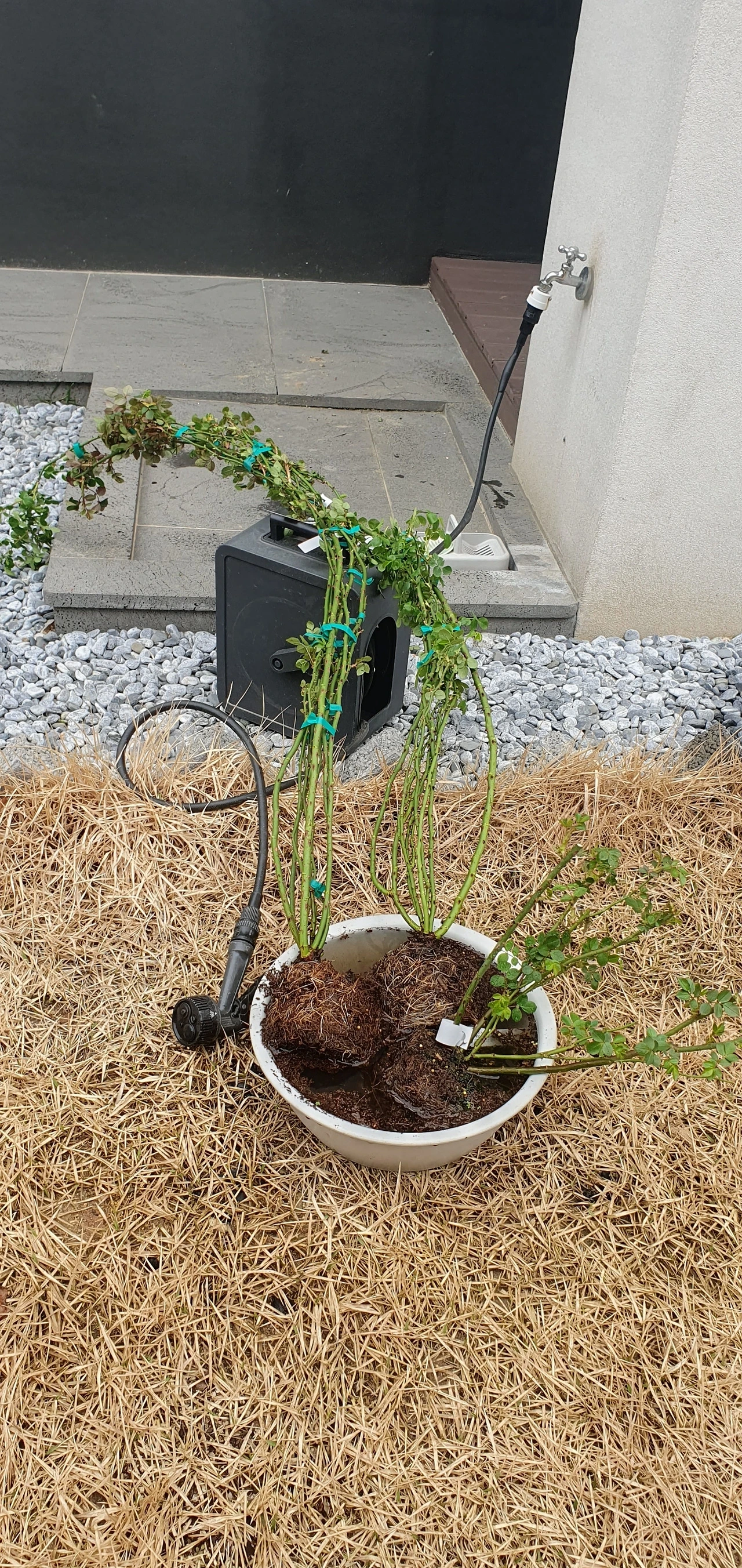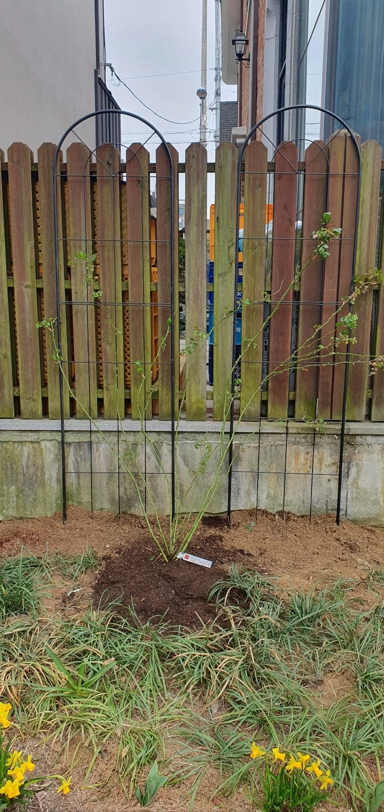 먼저 땅 장미 3종류를 심었다. 장미인지라 특급 대우를 2가지 받았다. 첫 번째는 전용 흙을 사용했다. 장미 전용 흙은 습기를 머금은 곱고 검은 모래흙처럼 보였다. 두 번째는 땅을 최대한 깊게 파줬다. 땀이 흐를 만큼 열심히 구덩이를 파서 물을 가득 채우고 장미 전용 흙을 붓고 장미를 심었다. 그리고 덩굴장미를 2종류를 심었다. 덩굴장미는 지지할 구조물이 필요하여 장미 휀스 2개와 아치 1개를 샀다. 아치는 정원 입구에 설치했다. 잔디를 파내서 아치를 박을 구멍을 냈다. 아치의 중심을 맞추고 구부러지지 않게 위치를 잡았다. 장미를 심을 부분에 잔디와 흙을 파내고 흙을 채웠다. 이제 장미 뿌리를 넣고 흙을 덮어준 뒤, 장미를 묶은 끈을 끊었더니 덩굴장미 자스미나의 모습이 드러났다. 그리고 휀스도 마저 조립하여 빨간색 덩굴장미 "플로렌티나"를 땅에 심었다. 이 작업을 마치고 장미 줄기를 동여 매어 놓은 끈을 끊는데 결혼식 신부 얼굴을 처음 보는 것 마냥 마음이 떨렸다. 펼쳐진 부채 모양처럼 장미 줄기를 휀스에 묶어서 고정했다. 이렇게 비료와 땅파기의 힘이면 장미가 잘 자랄것 같았다.